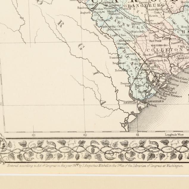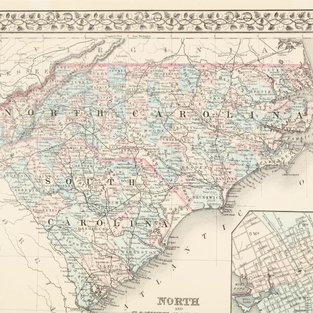 S[amuel] Augustus Mitchell. NORTH AND SOUTH CAROLINA. [Philadelphia]: S. A. Mitchell, [1880]. With hand-coloring and inset plan of Charleston. From Mitchell's New General Atlas. Well-presented under a mat and in a gilt wooden frame.