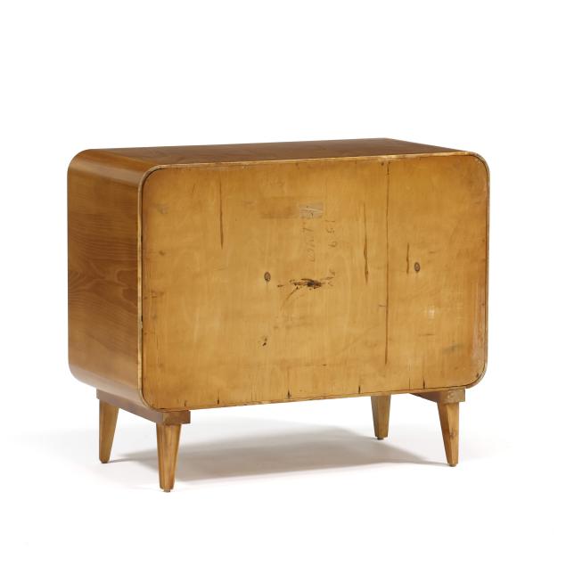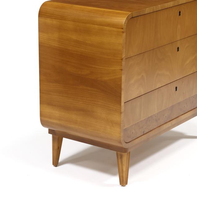 Circa 1940, book-matched elm veneers, case with rounded corners, three flush drawers, the bottom drawer with line and burl wood banded inlays, splayed molded tapered legs, unmarked.