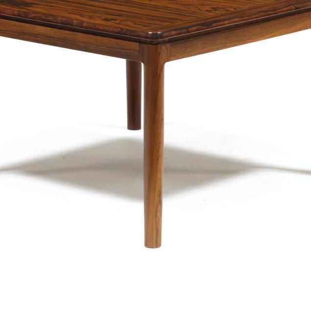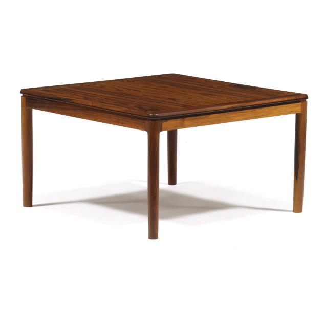 Circa 1960, rosewood veneer, square top with banded edge, molded skirt, rounded legs, appears unmarked.