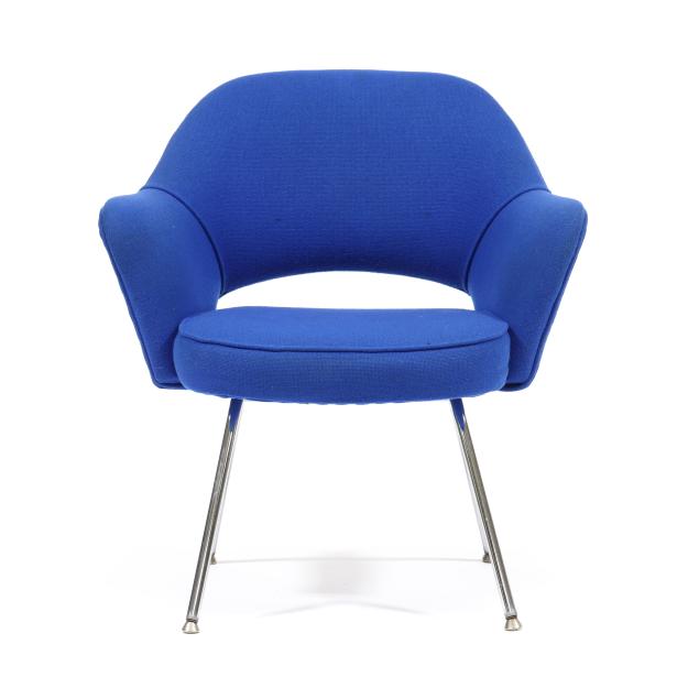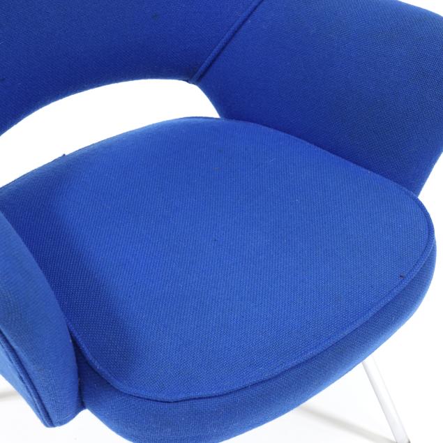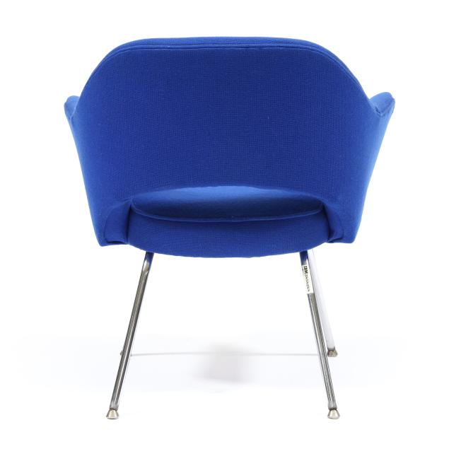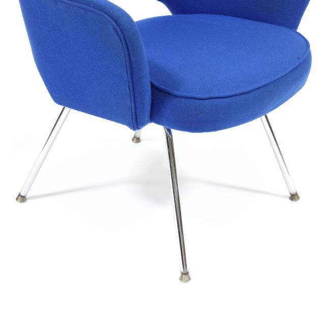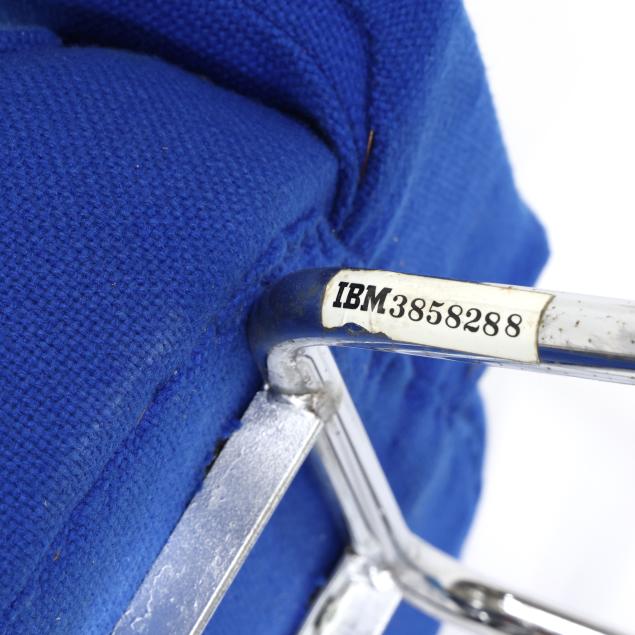 Circa 1980, blue upholstery, polished steel legs, unmarked other than an IBM number.