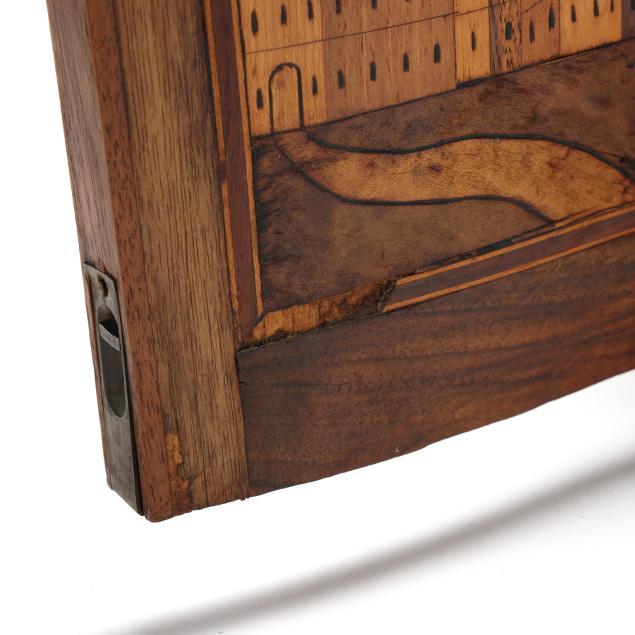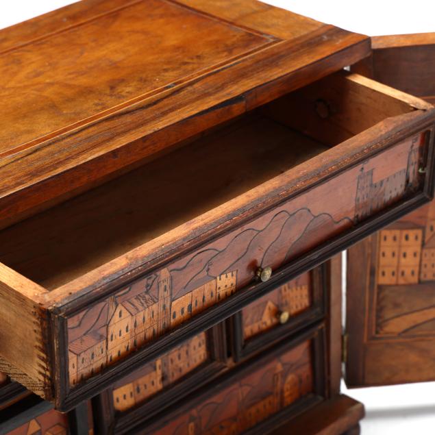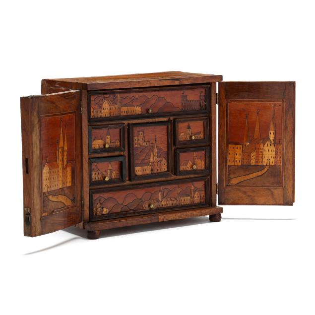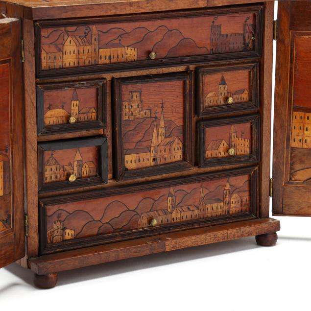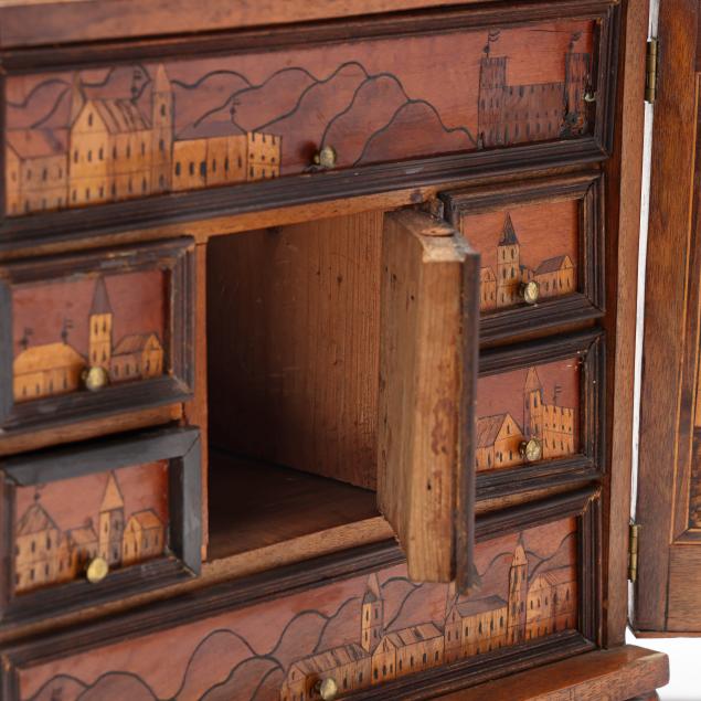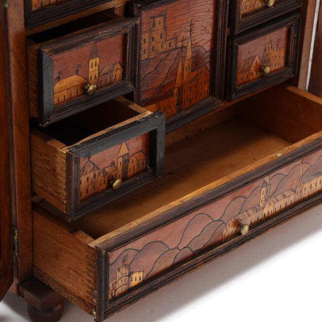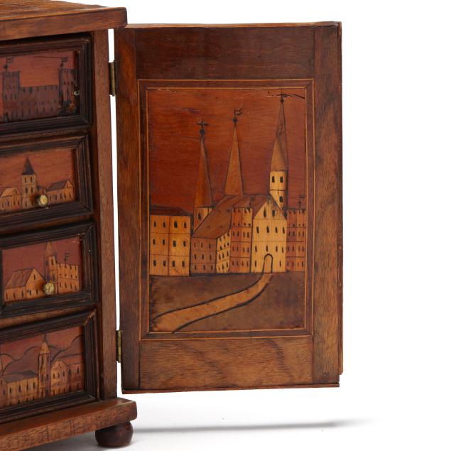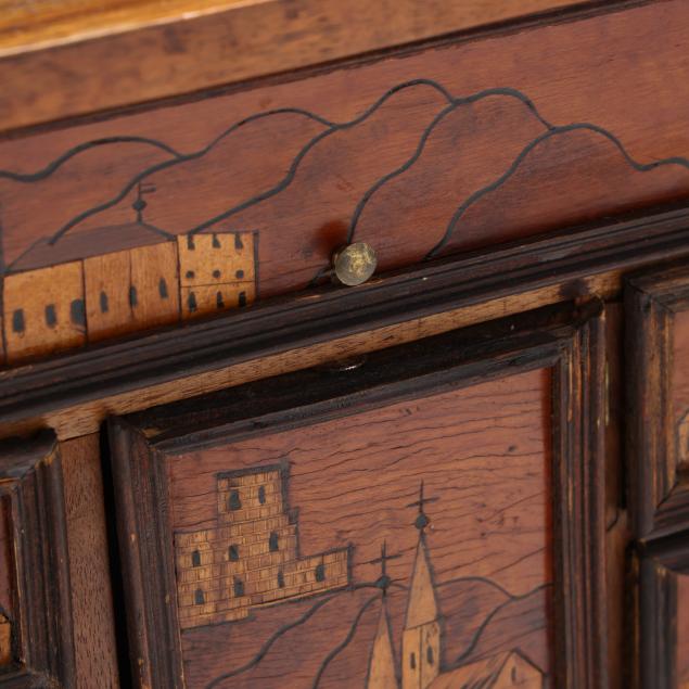 First half 20th century, walnut veneers, pine secondary, unsigned, rectangular form with silver toned escutcheon mount, dual cabinet doors with mixed wood line inlays, opening to six rectangular drawers with brass pulls and central prospect drawer, the faces all decorated with an inlaid folky cityscape, raised on four feet.