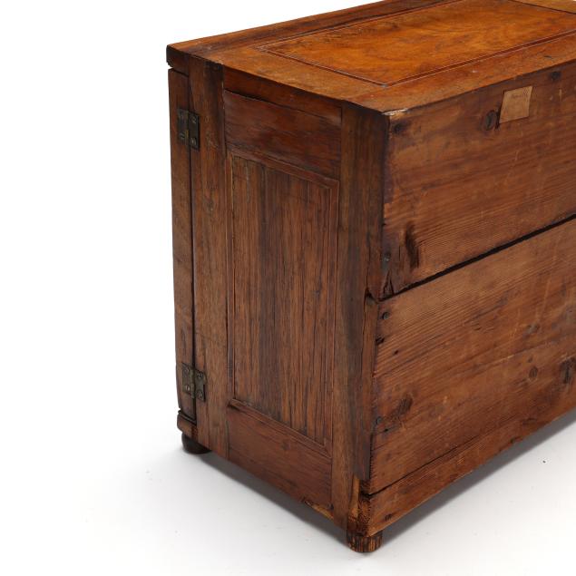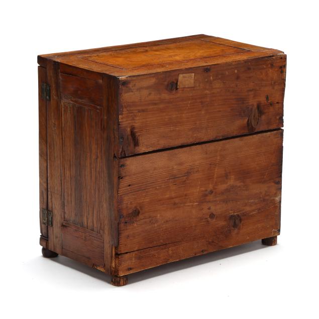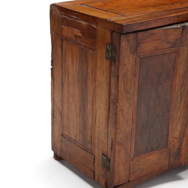 Scattered veneer losses to exterior and interior; some glue residue visible to drawer faces; left cabinet door with some warping.