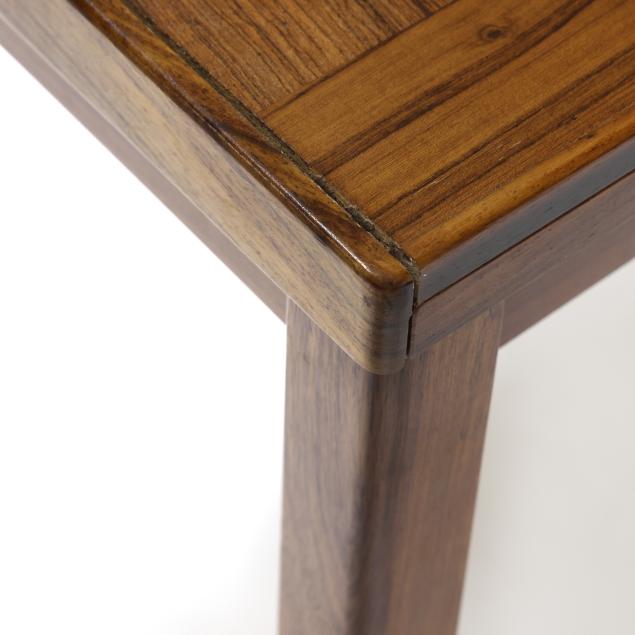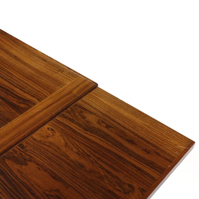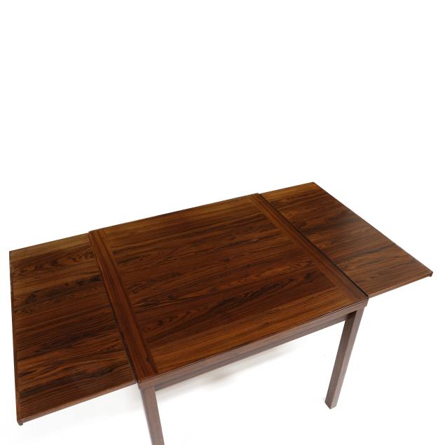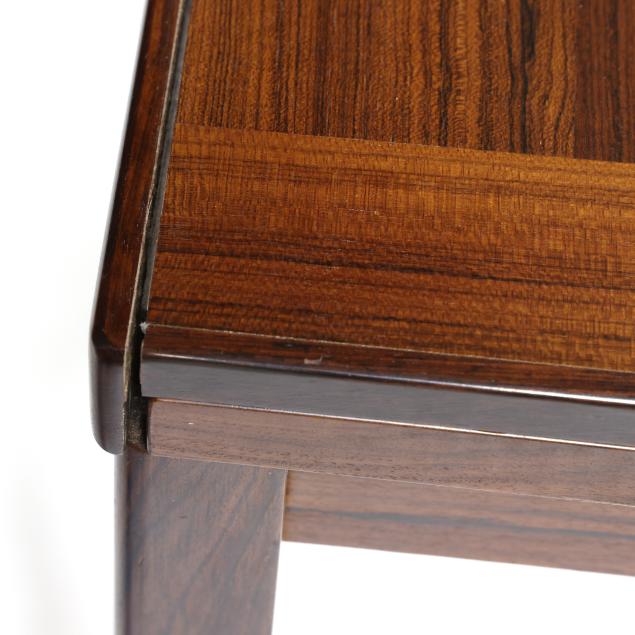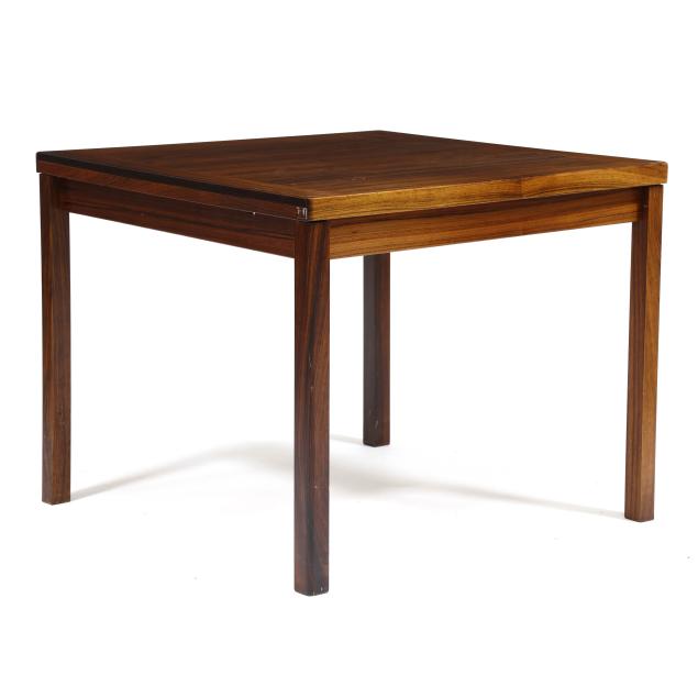 Circa 1970, rosewood veneer, square top with banded edge, two draw leaves, rounded straight legs, appears unmarked.