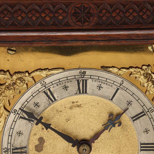 Late 19th-early 20th century, rectangular Gothic style carved oak case, gilt brass dial with silvered chapter ring and Roman markers signed "J. BRYSON EDINBURGH", with brass dual train movement, works stamped "W & H Sch." for the German company of Winterhalder & Hofmeier (Schwarzenbach), striking on a coiled gong on the half and hour. Includes pendulum and winding key.