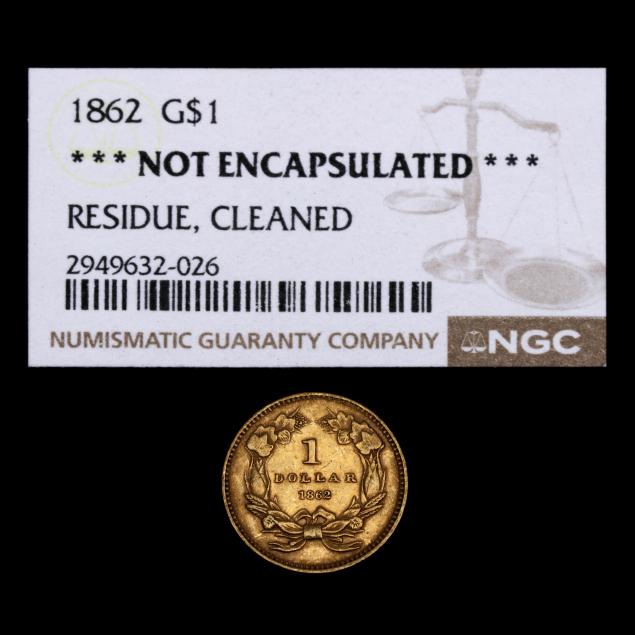 1862 $1 Gold Indian Princess, NGC - "RESIDUE, CLEANED"