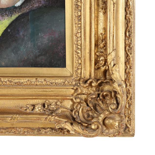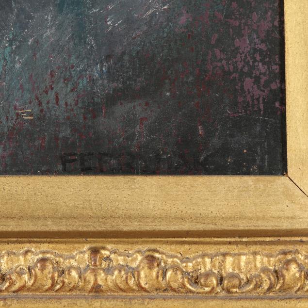 Oil on panel, signed at lower right, presented in an ornate giltwood frame.