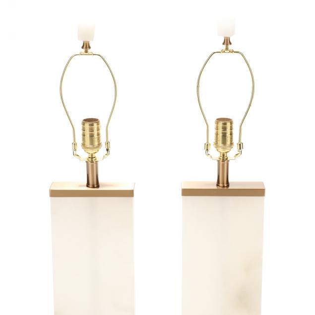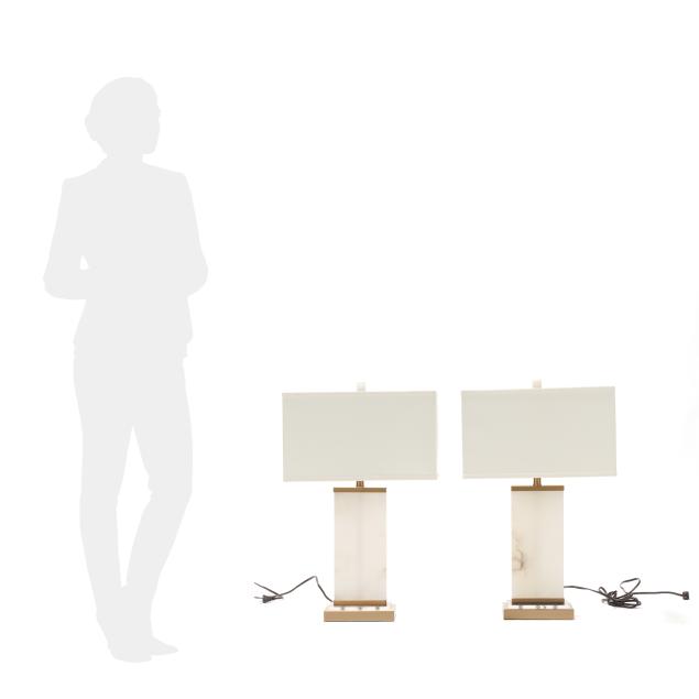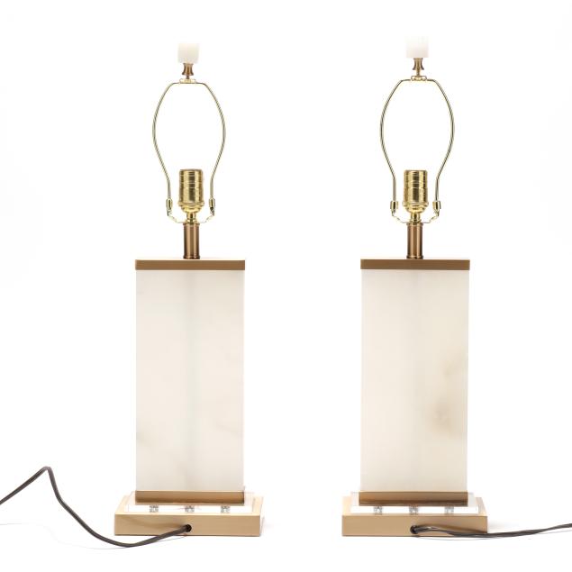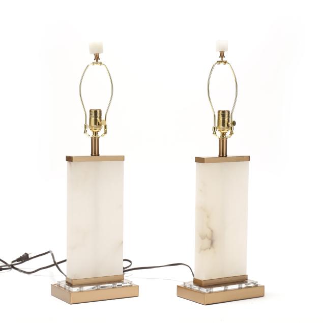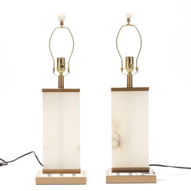 Rectangular alabaster base mounted to gold toned and acrylic base, metal mounts, alabaster cube finials, and rectangular cloth shades, marked with serial numbers and "MADE IN CHINA" to underside.