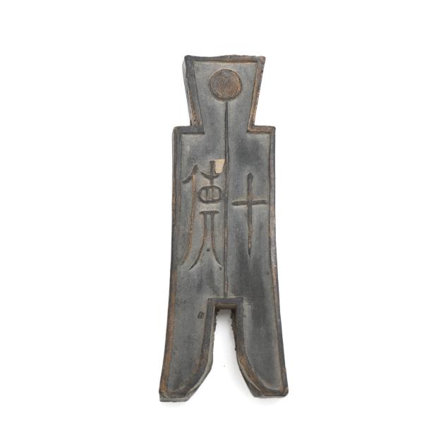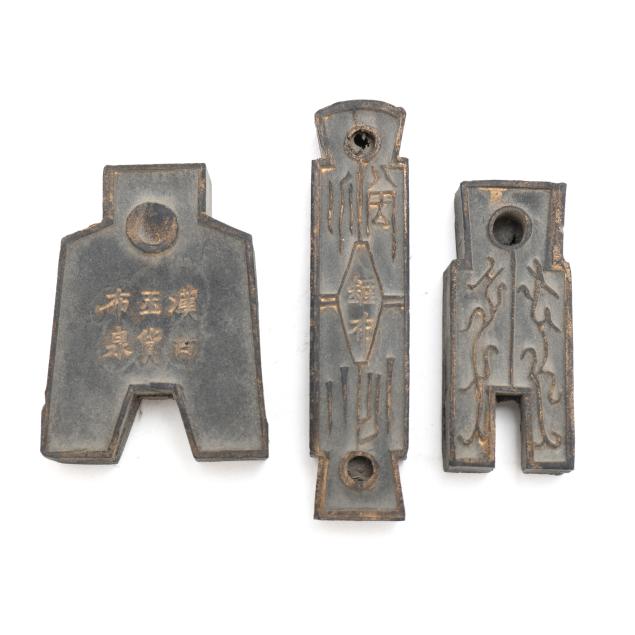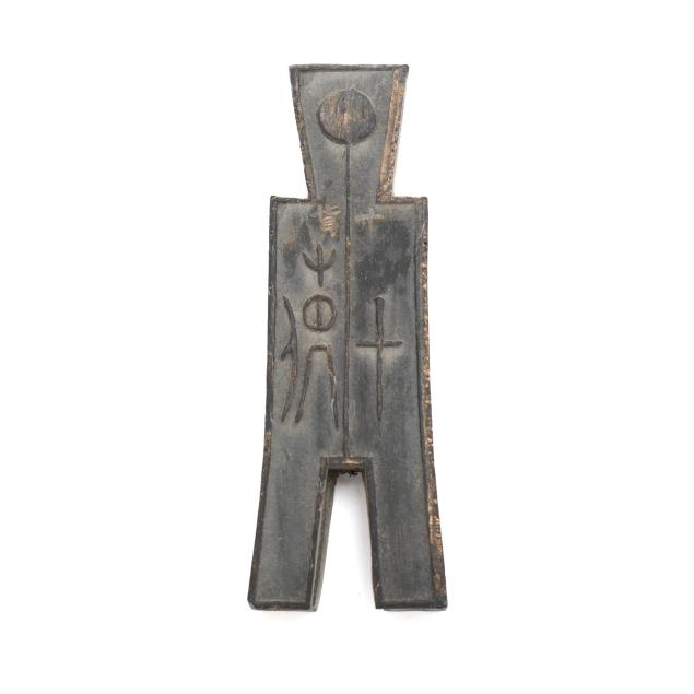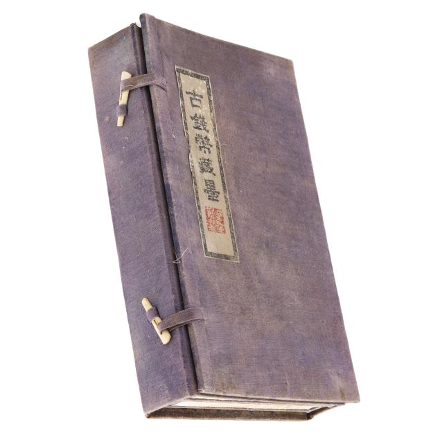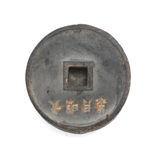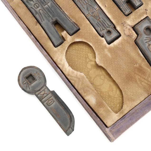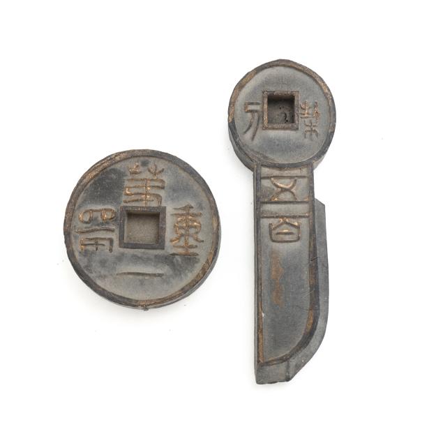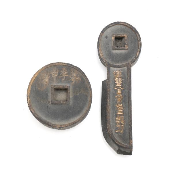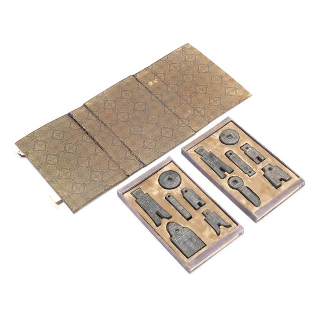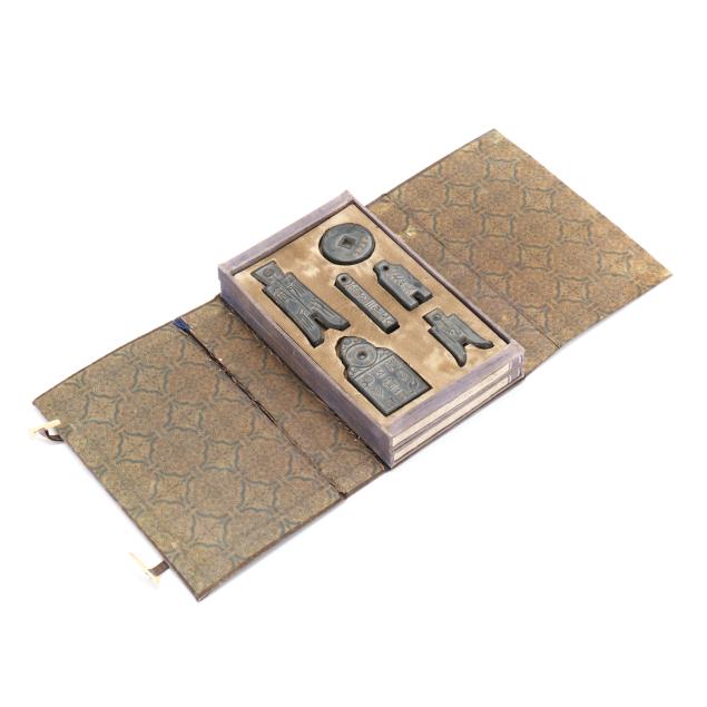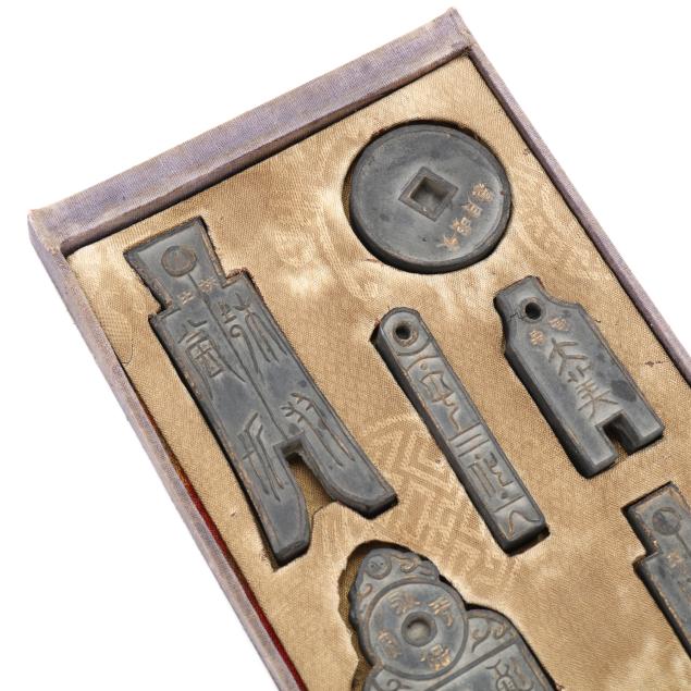 Early 20th century, six archaic money shaped ink stones incised with cleric and seal script in gilt presented in two fitted boxes enclosed within an outer cloth case with frog closures, labeled together with a red seal.