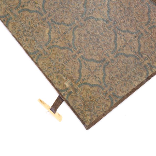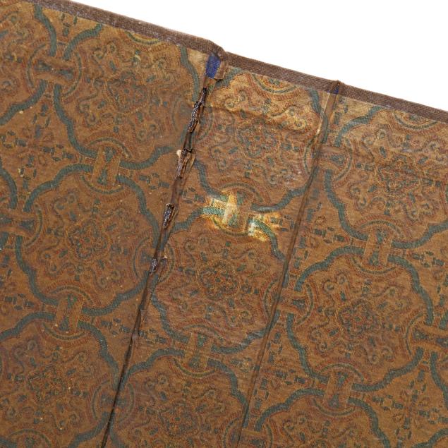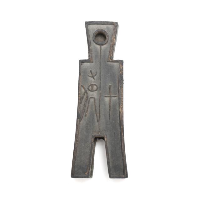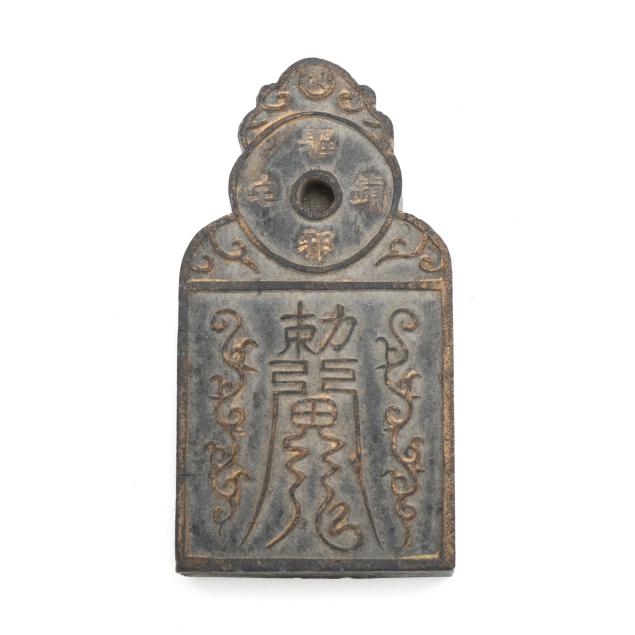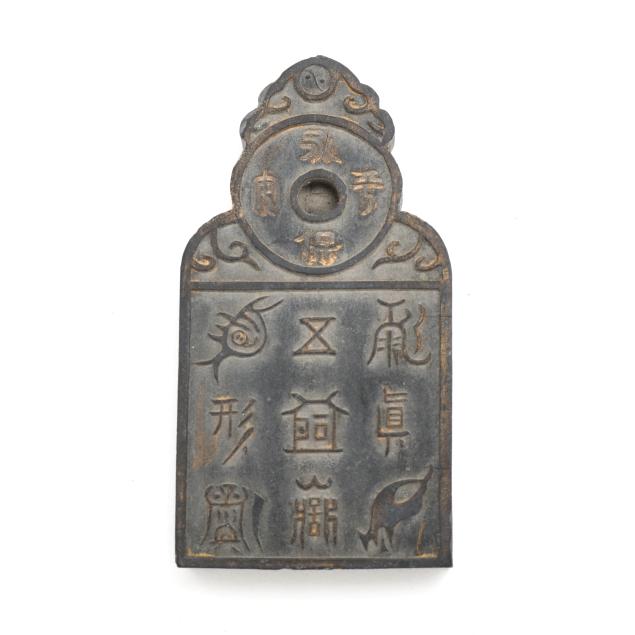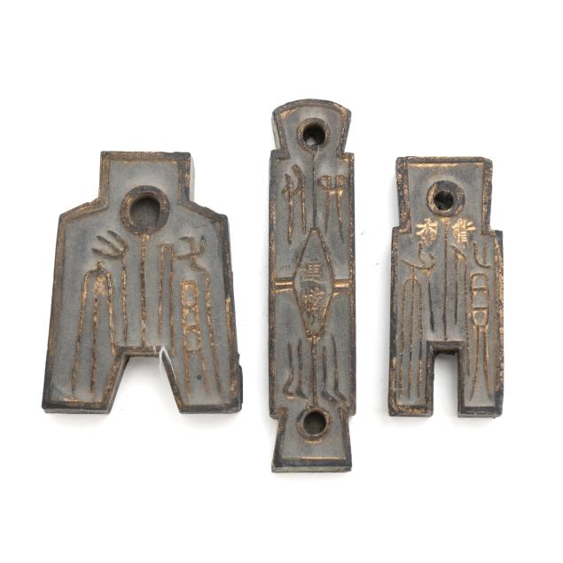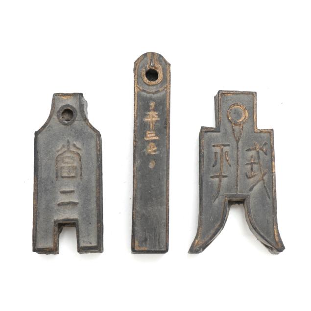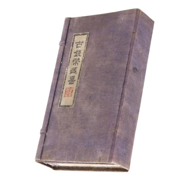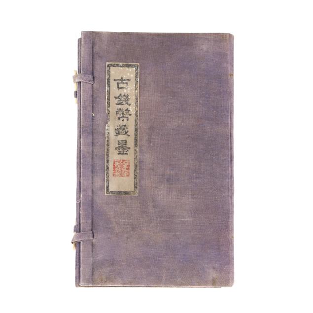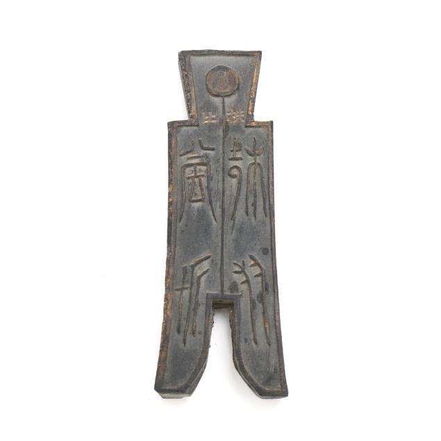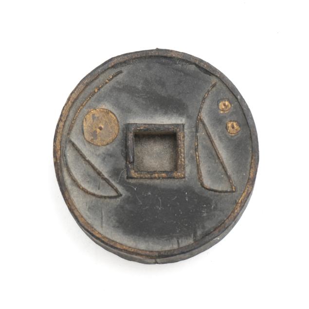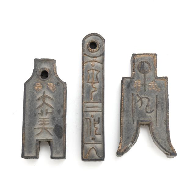Early 20th century, six archaic money shaped ink stones incised with cleric and seal script in gilt presented in two fitted boxes enclosed within an outer cloth case with frog closures, labeled together with a red seal.