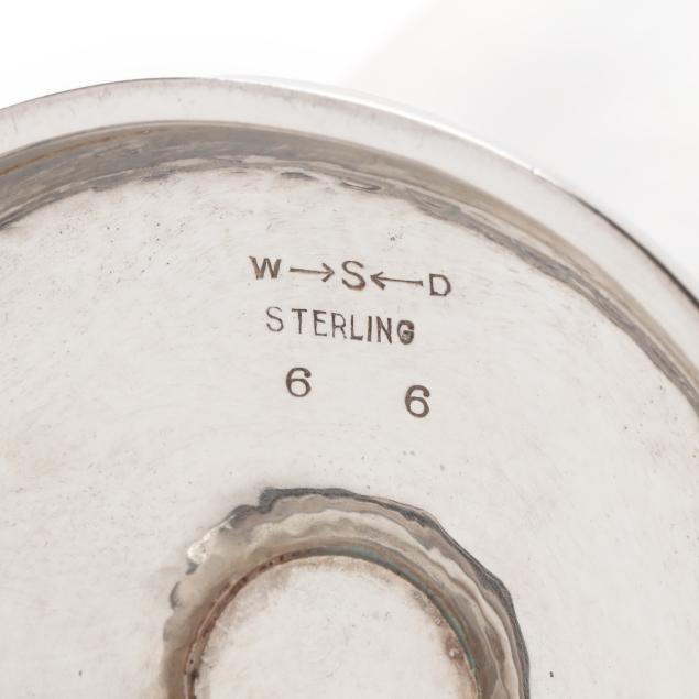 Mid-20th century, pattern number 66, marked of "WSD", each a flared form with round base featuring a hand-hammered surface, not monogrammed.