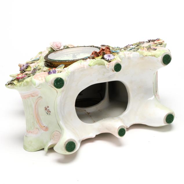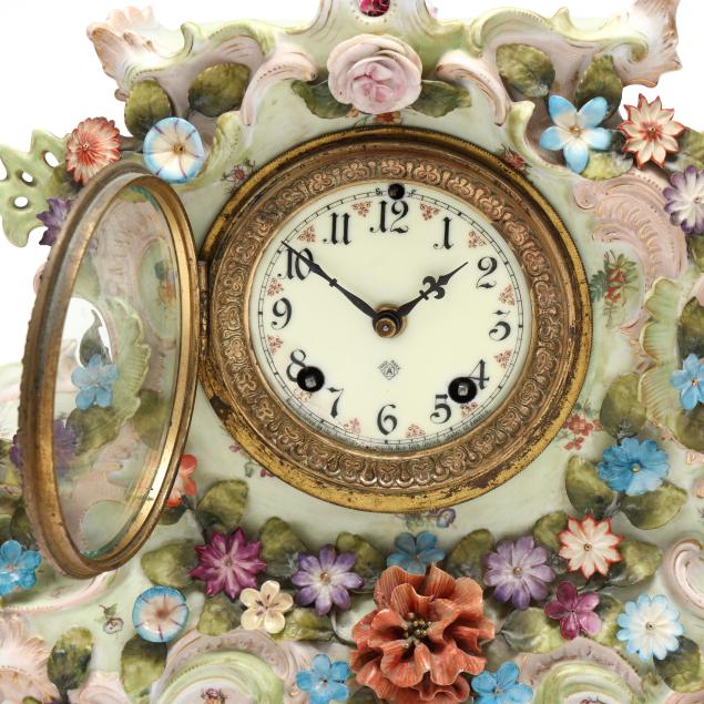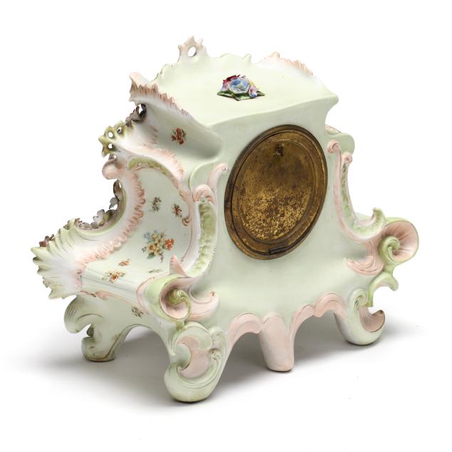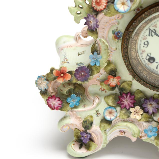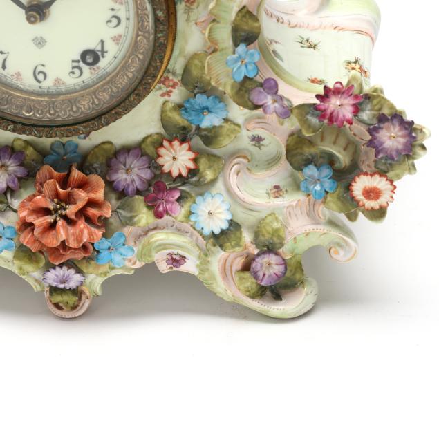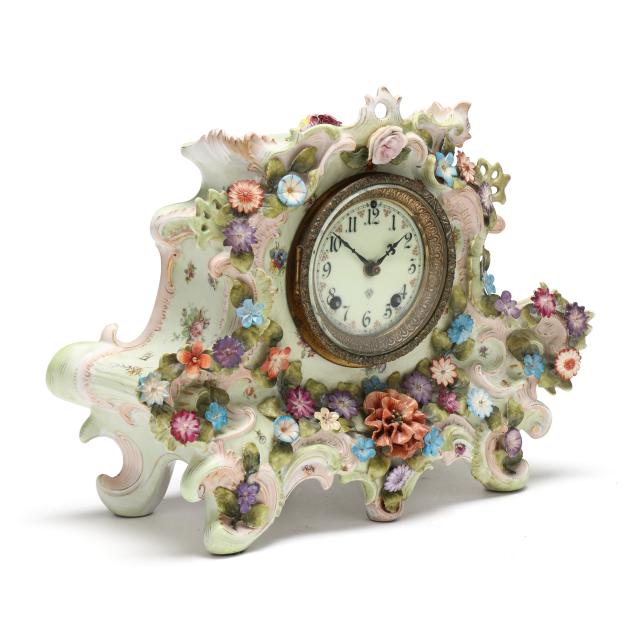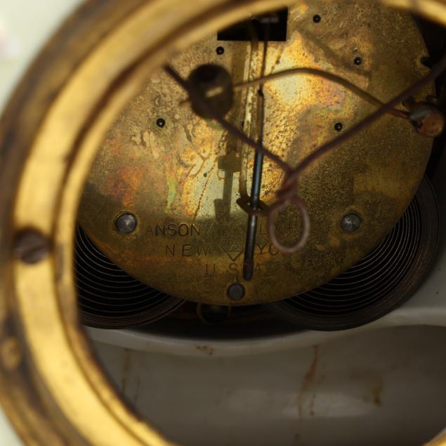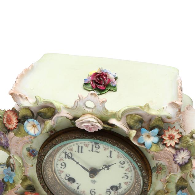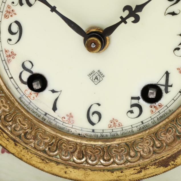 New York, early 20th century, Louis XV style rocaille case in hand-painted and gilt porcelain, decorated in applied floral relief, centering a 3 1/2-inch enamel dial with Arabic chapters, signed to the lower edge and with company monogram logo, dual train spring movement skriking on a bell, stamped to the backplate "ANSONIA CLOCK CO. / NEW YORK / USA", includes brass pendulum.
