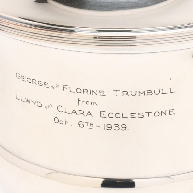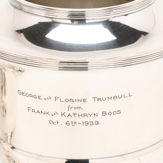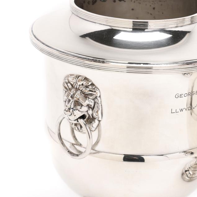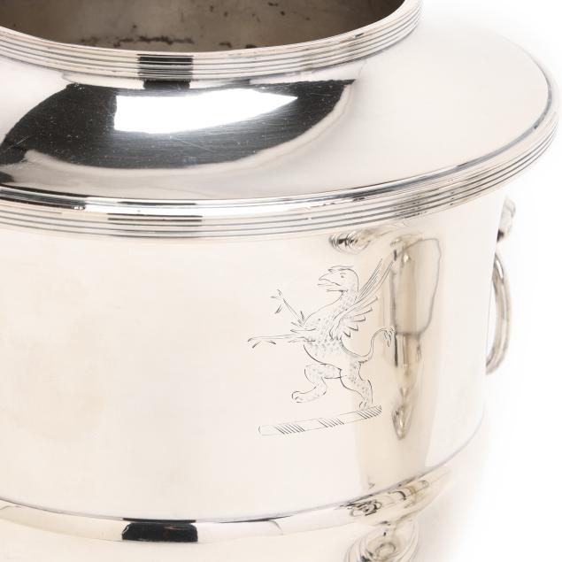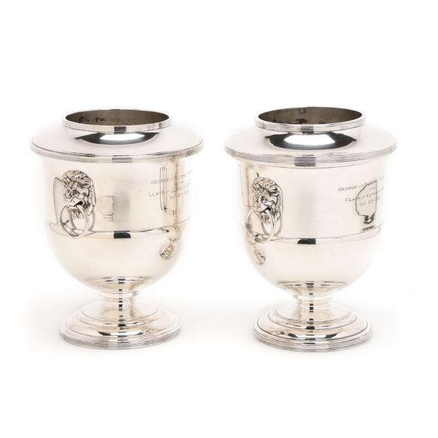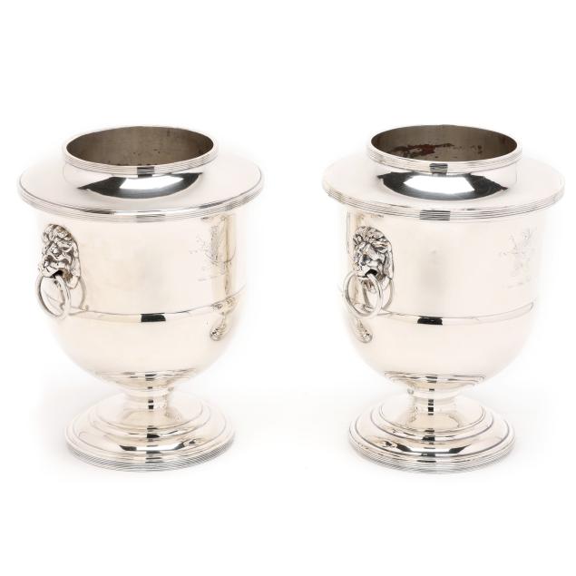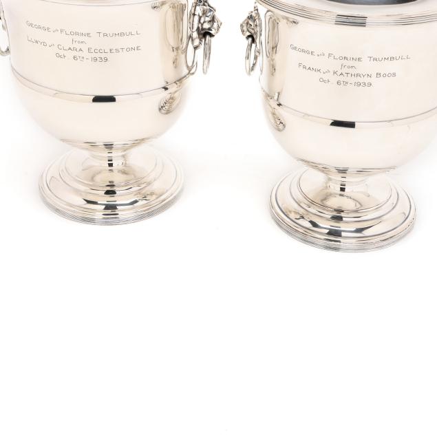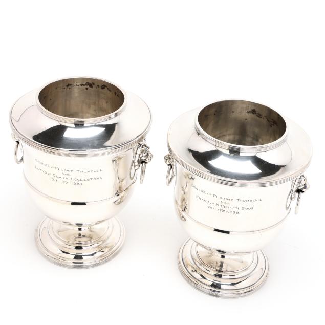 20th century, two part form wine coolers with dual lion's mask ring handles, each inscribed "George and Florine Trumbull / from / Frank and Kathryn Boos / Oct. 6th - 1939" to one side of body and with an engraved griffin to the other, both marked "MADE IN ENGLAND", pattern number 61444.