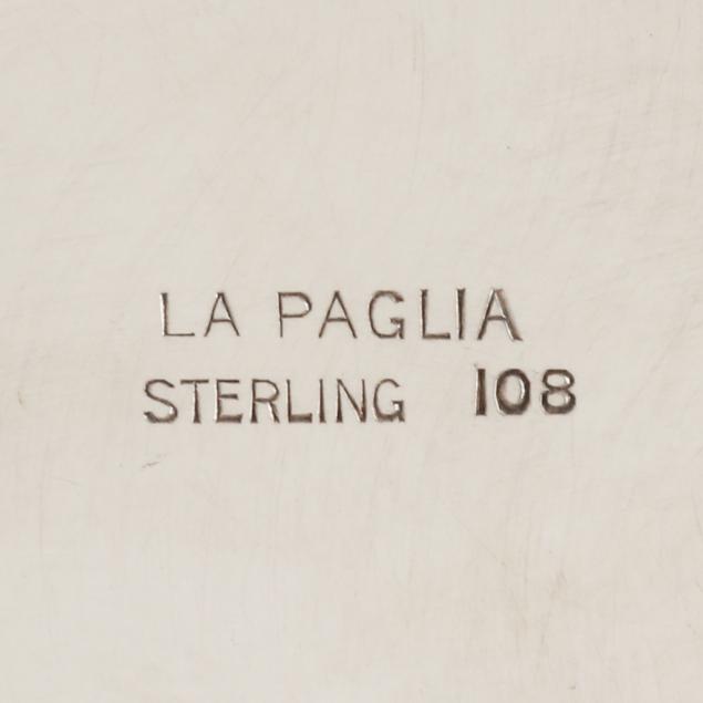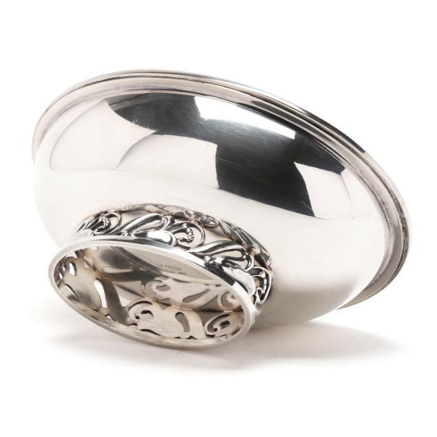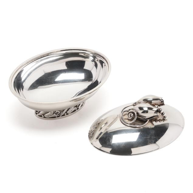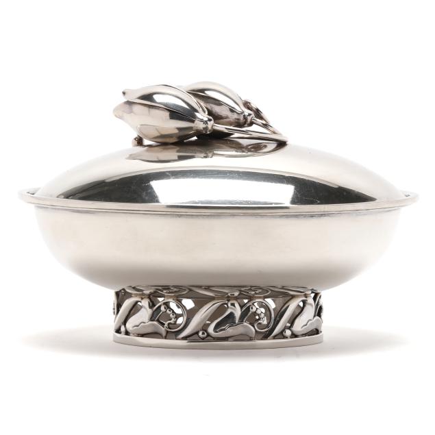 Following Georg Jensen, USA, circa 1950, pattern number 108, ovoid form over an openwork floral pedestal, with scrolled budding flower knob on cover.