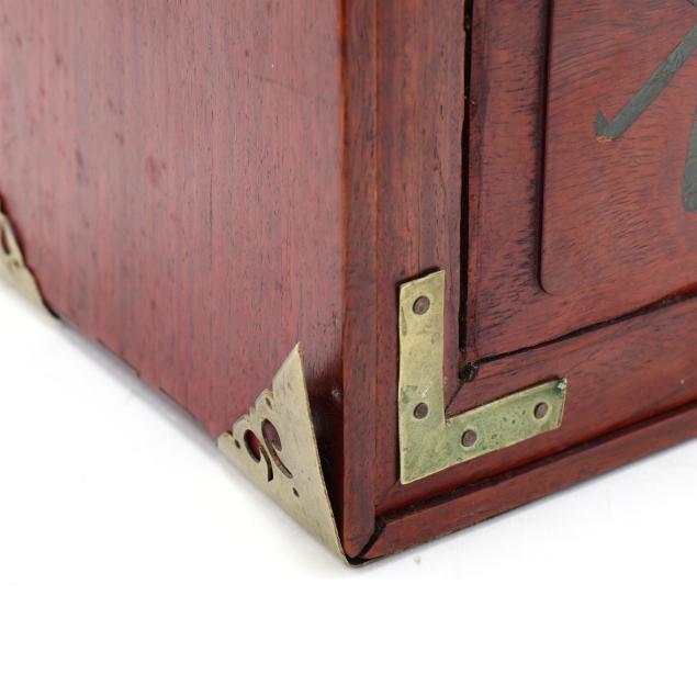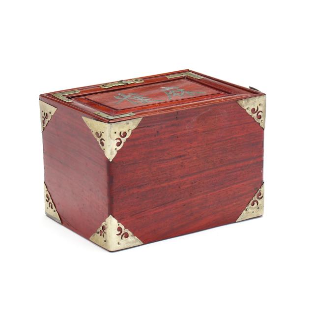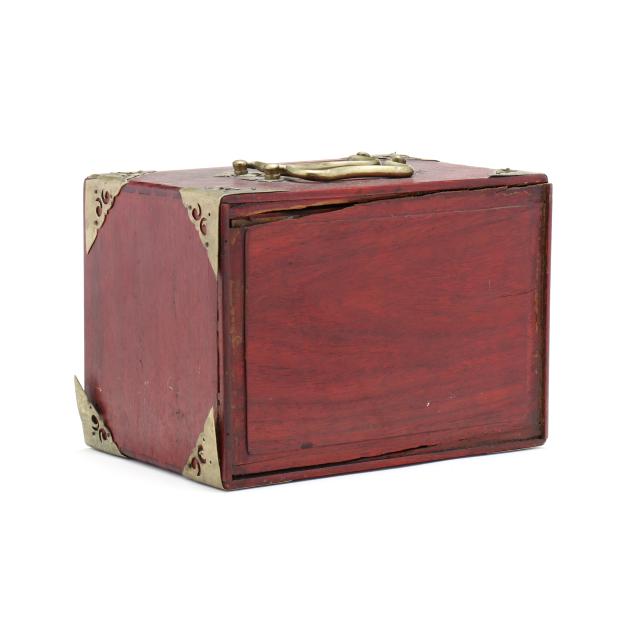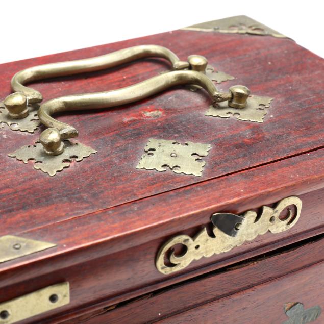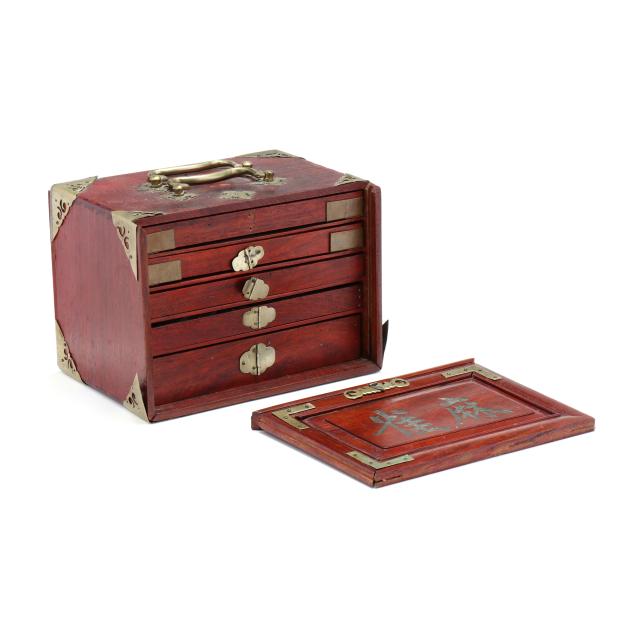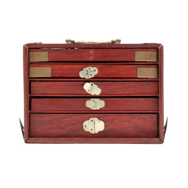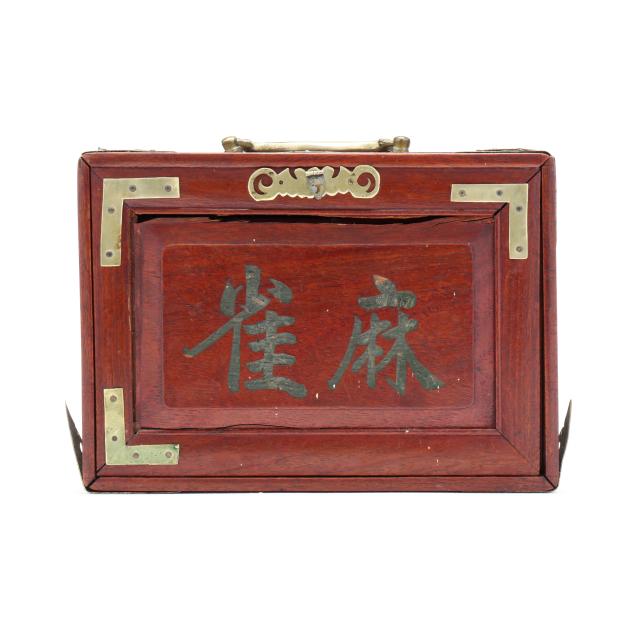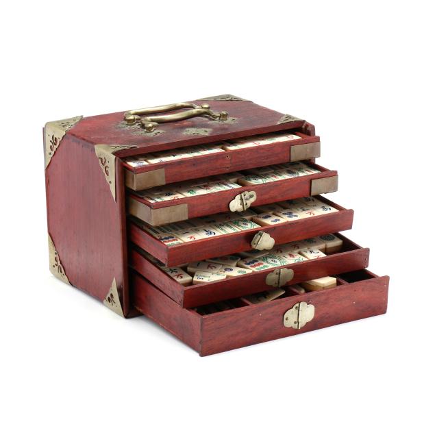 Early 20th century, a Chinese Mahjong set in a wooden dovetailed case with decorative metal mounts, sliding front cover with two Chinese characters in green, shaped carrying handles to the top, five graduated drawers containing bone and bamboo playing pieces, consisting of 140 decorated tiles, 4 blank tiles, and numerous counters and dice.
