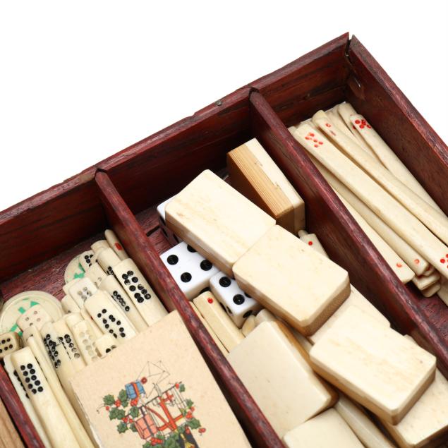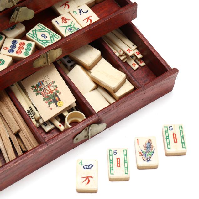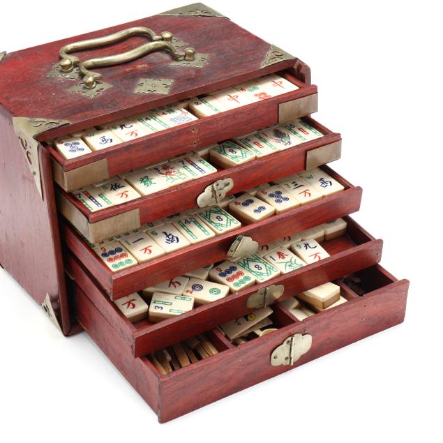 Full set of Mahjong tiles; some warping to wood case; crack and loss to front and back wood panels; lifting to hardware; bending and loss to one drawer pull.