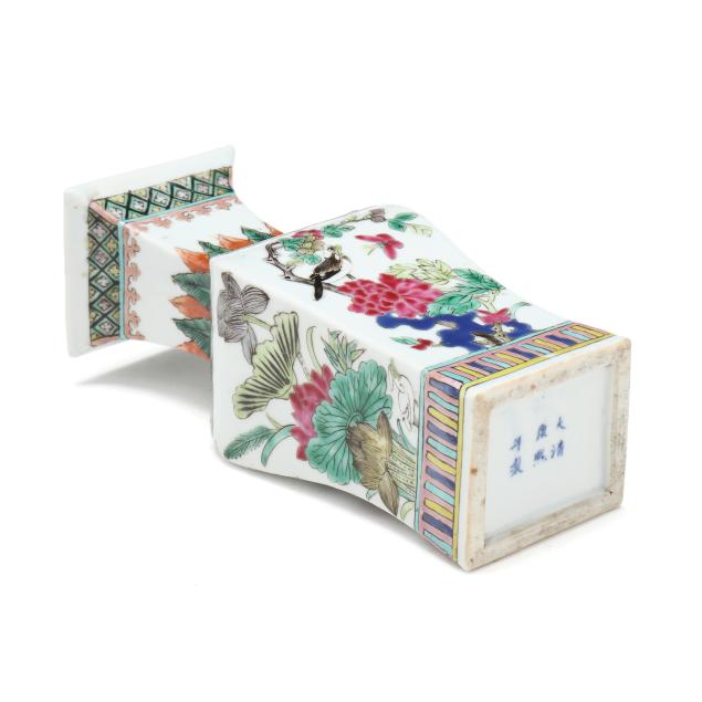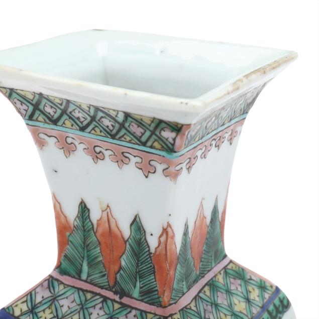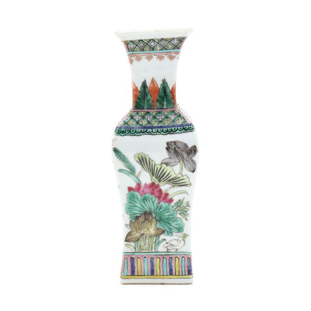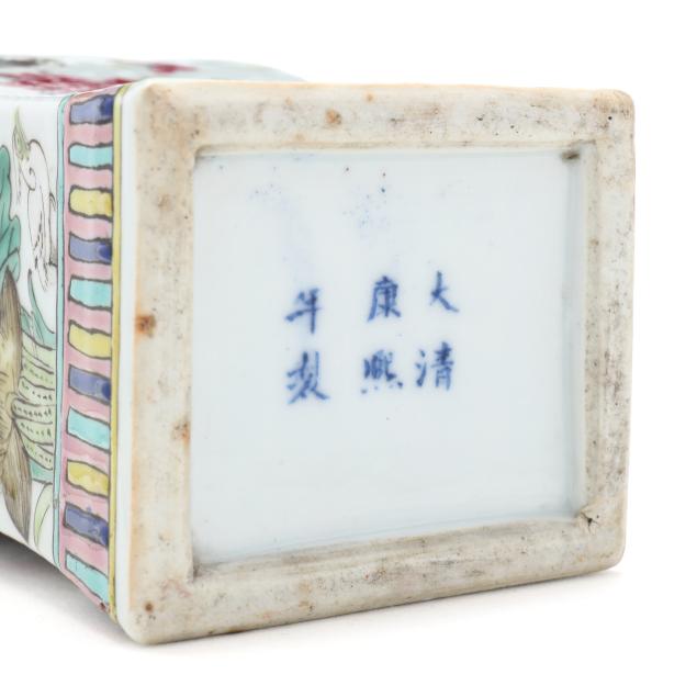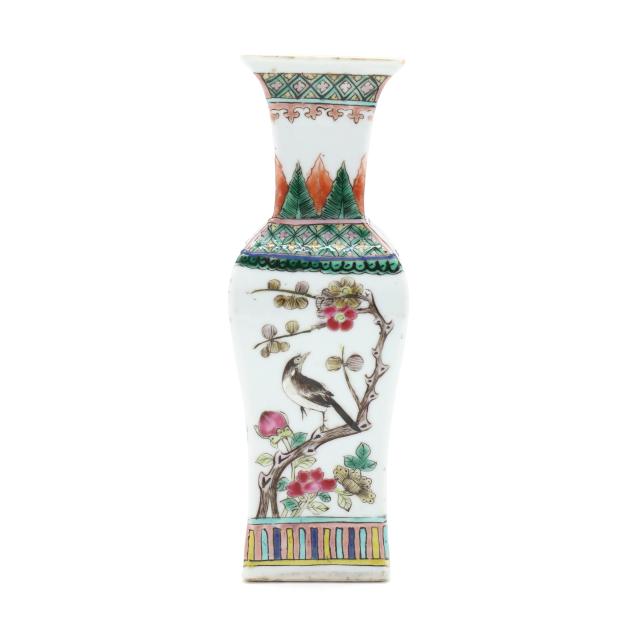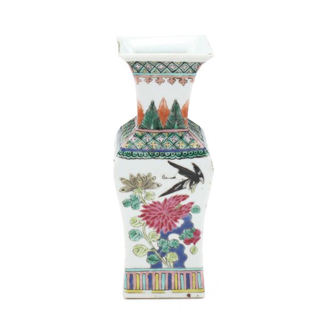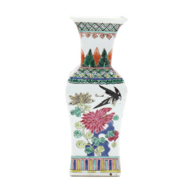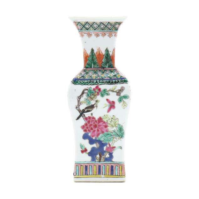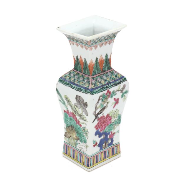 Mid to late 19th century, porcelain vase with square neck and foot, hand painted in polychrome enamels with birds and flowers to each side, patterned borders above and below main decoration, with an apocryphal six character Kangxi mark to the underside.
