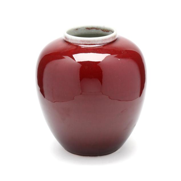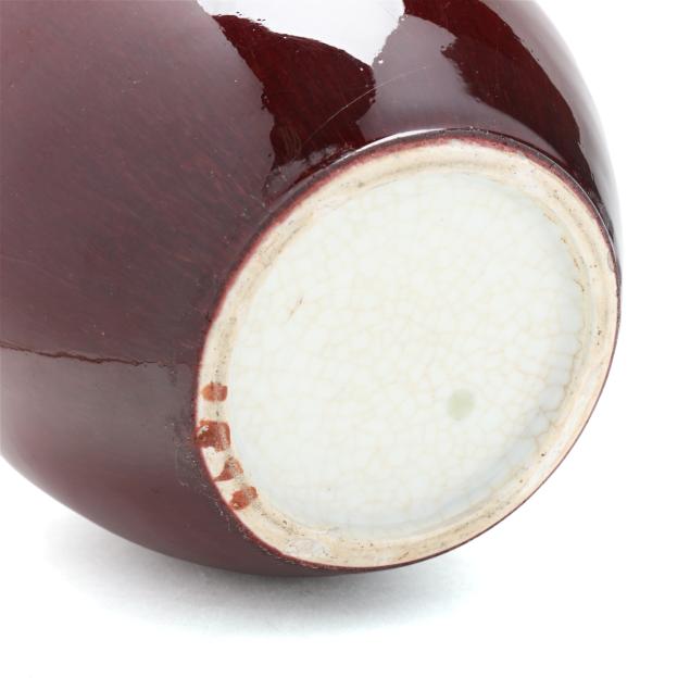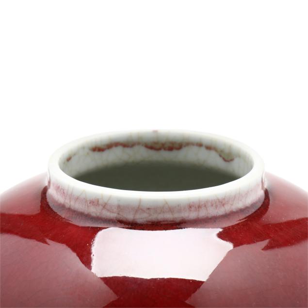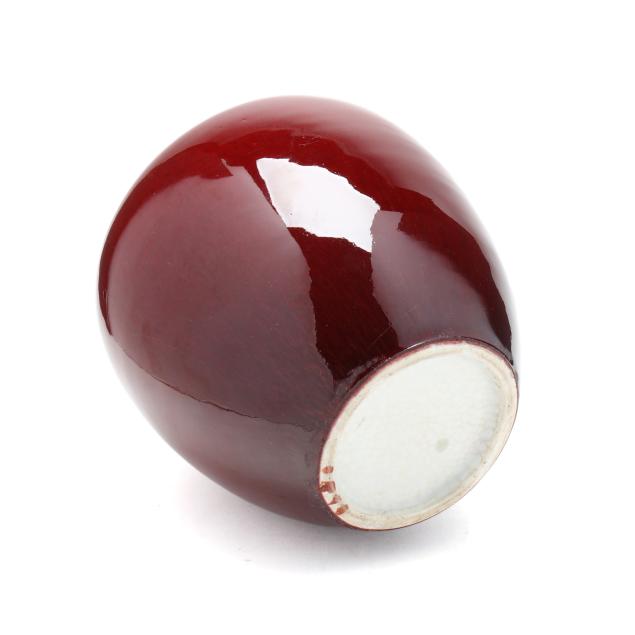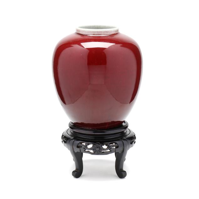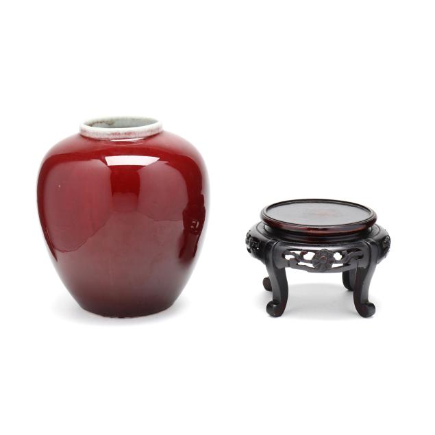 19th century, with a rich red glaze lightening at rim, both the underside and mouth rim with light gold tan crackle to cream glaze, presented together with a raised carved wood stand.