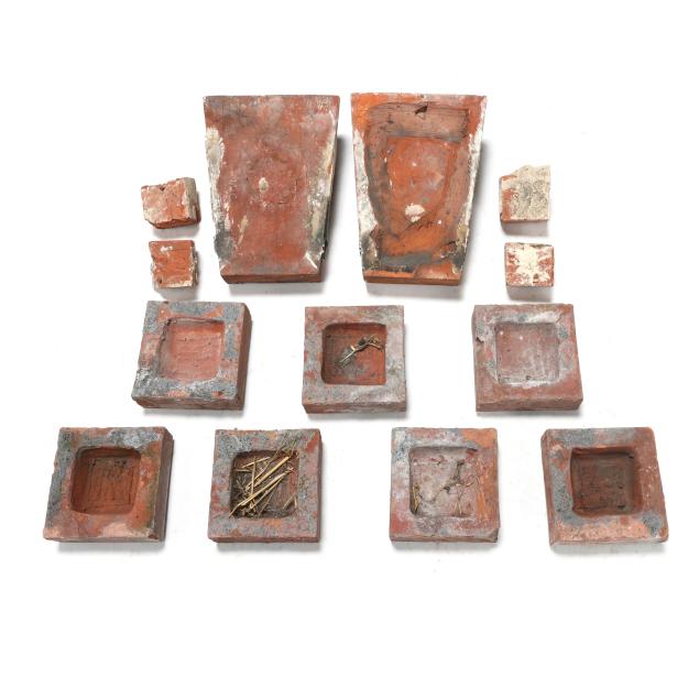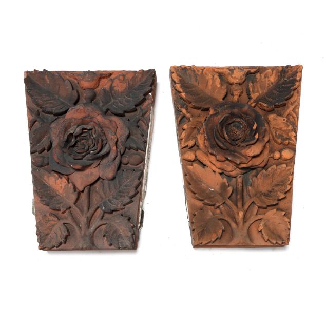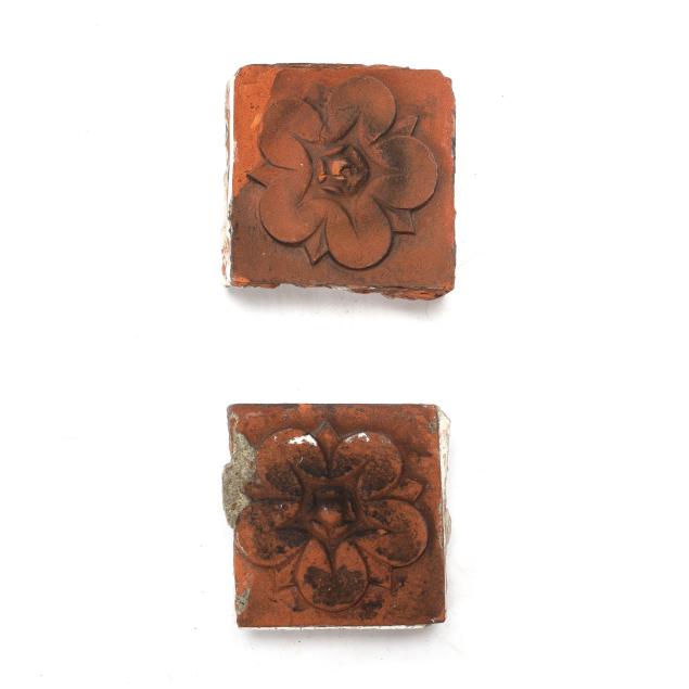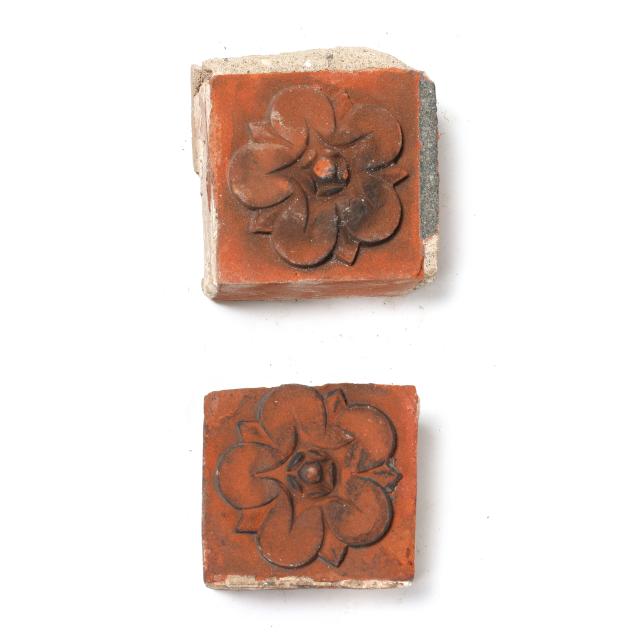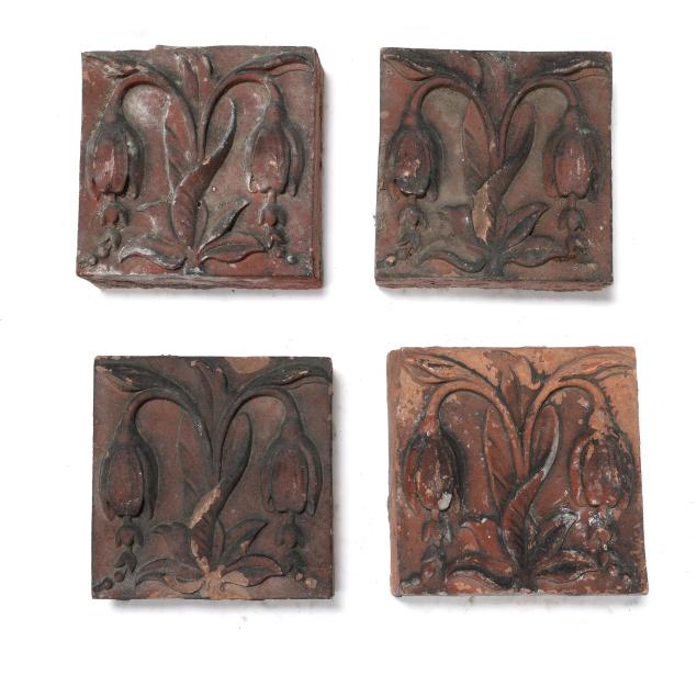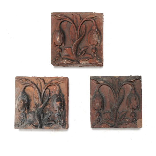 Late 19th century, (13) deeply molded terracotta tiles to include (4) small square tiles with Tudor roses (3 x 3 in.); (7) square tiles with Arts & Crafts style tulips with intertwining stems (6 1/4 x 6 1/4 in.); and (2) large tapered rectangular tiles with large roses (12 1/4 x 9 in.), unmarked.