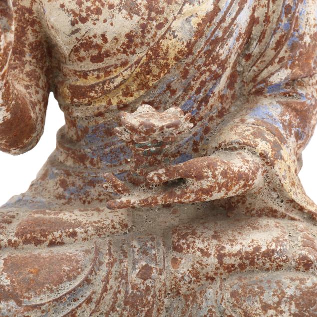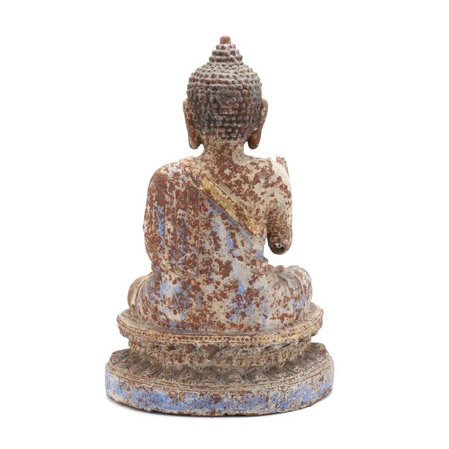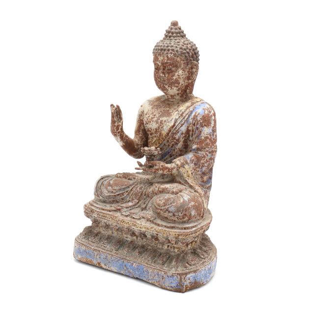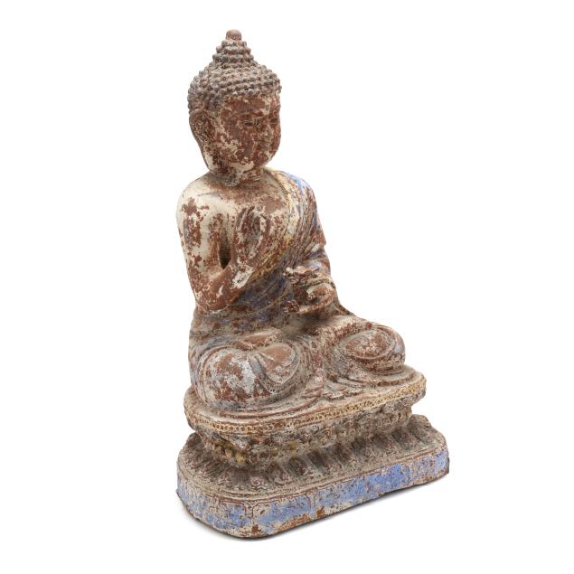A polychrome painted cast iron figure of a seated Buddha, on a double lotus base, comes together with a fitted wooden base.
