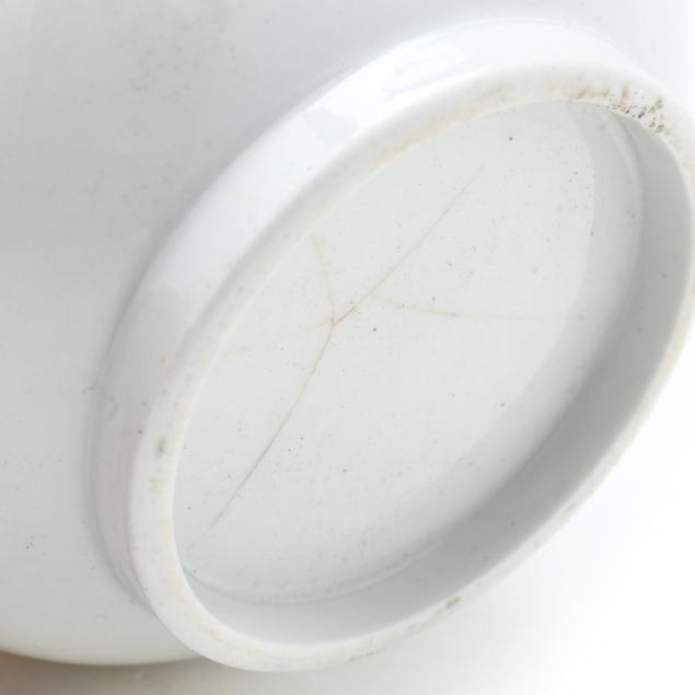 Bowls with condition issues: largest with star hairline to underside; next largest with chip and loss to rim; next one with two chips to rim; and smallest with nicks to rim and through break with repair.