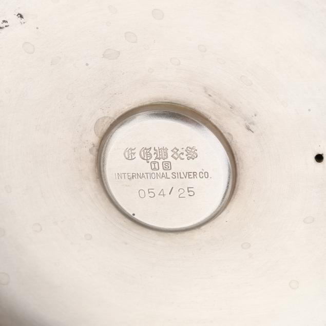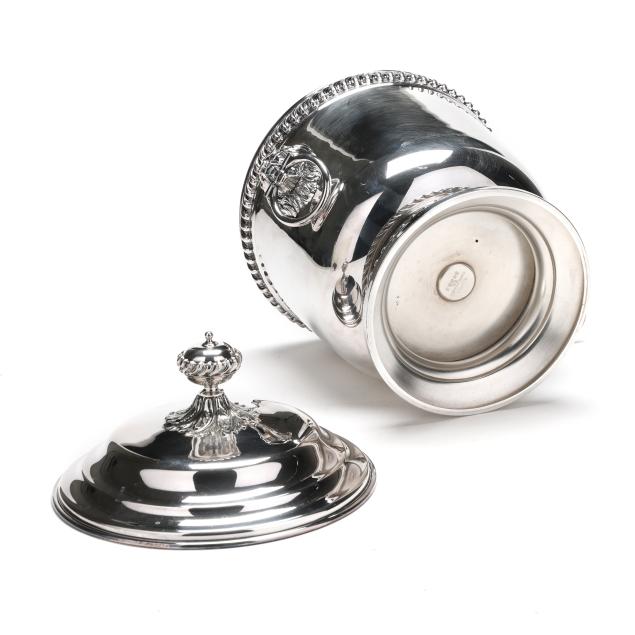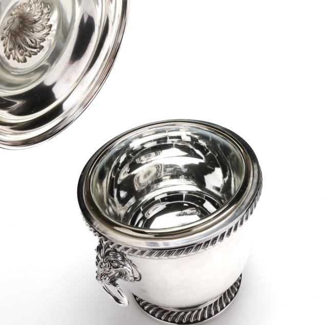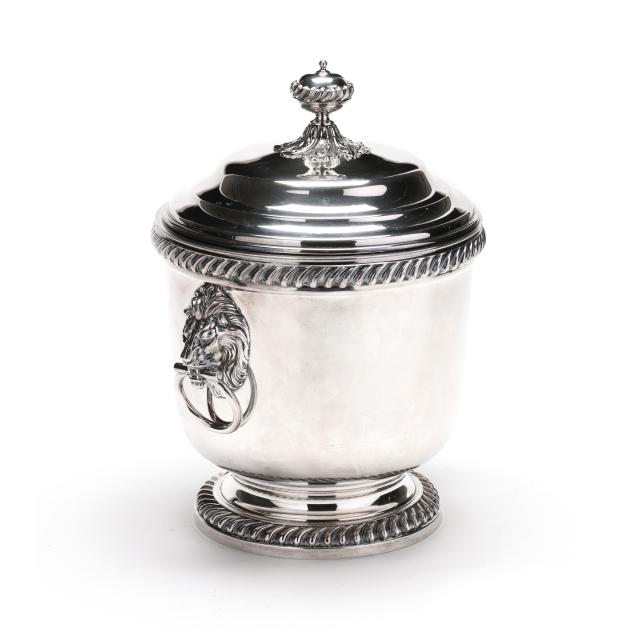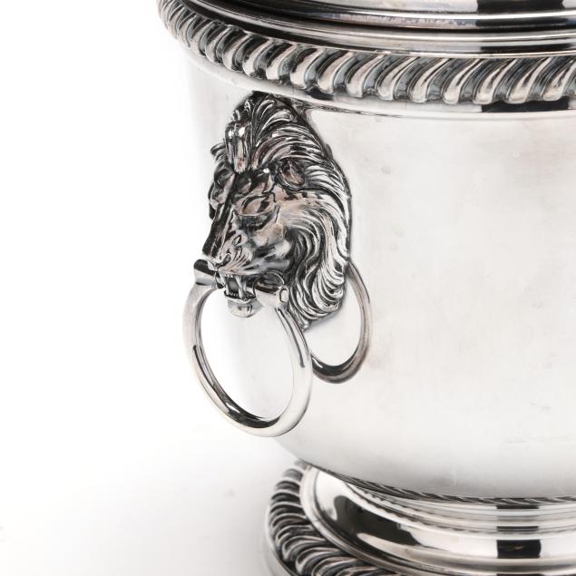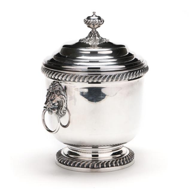 Footed ice bucket with dual lion mask ring handles and urn form finial to lid, with International Silver Co. marks to underside, not monogrammed.