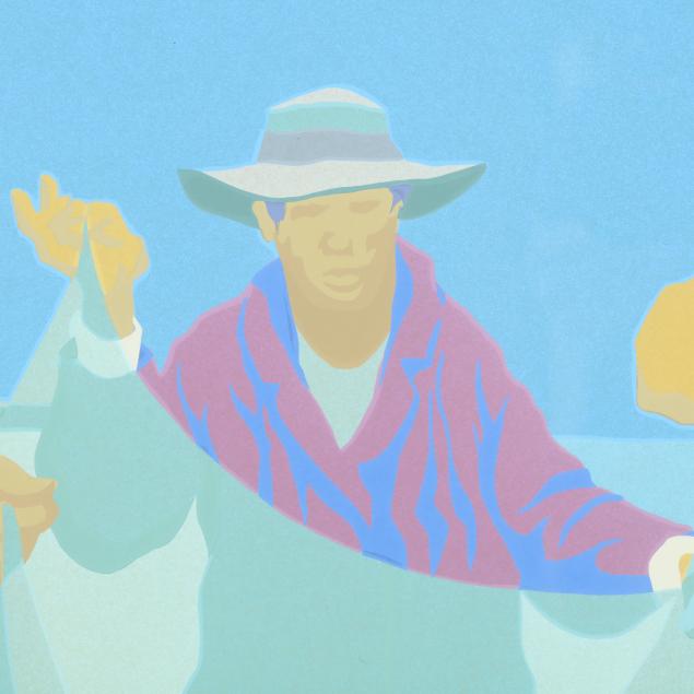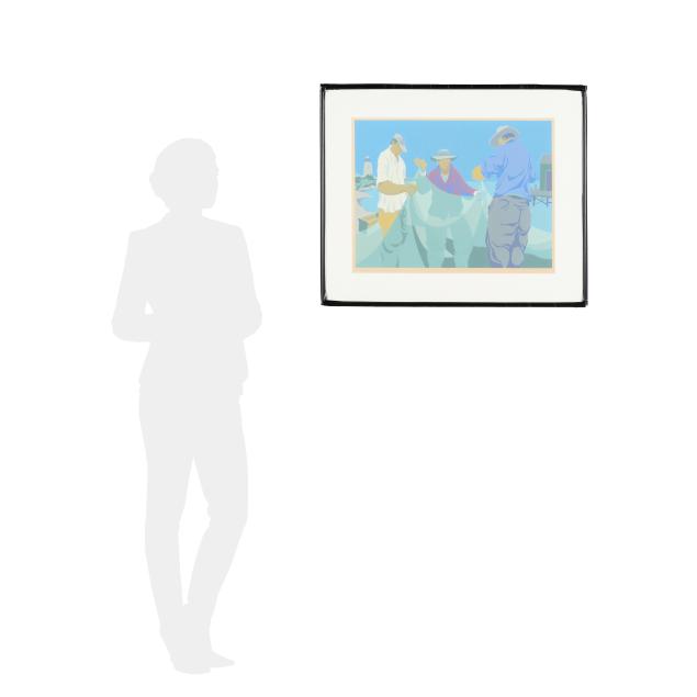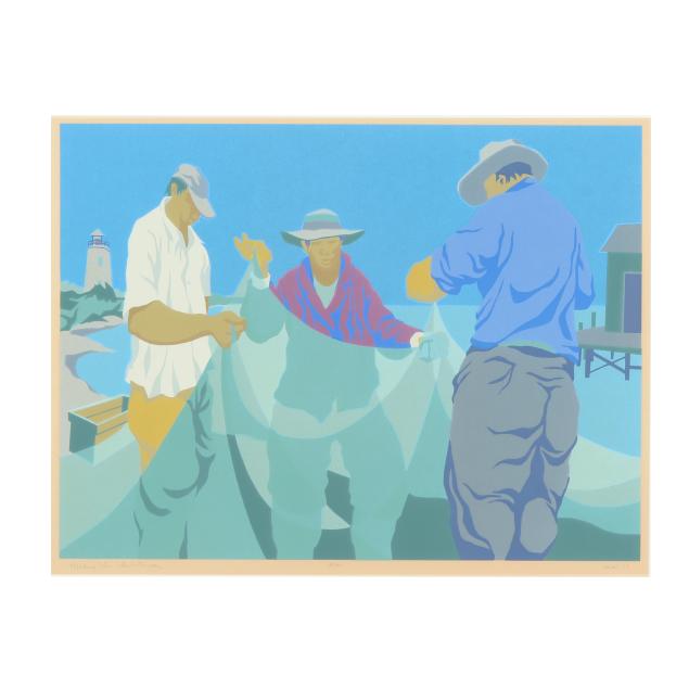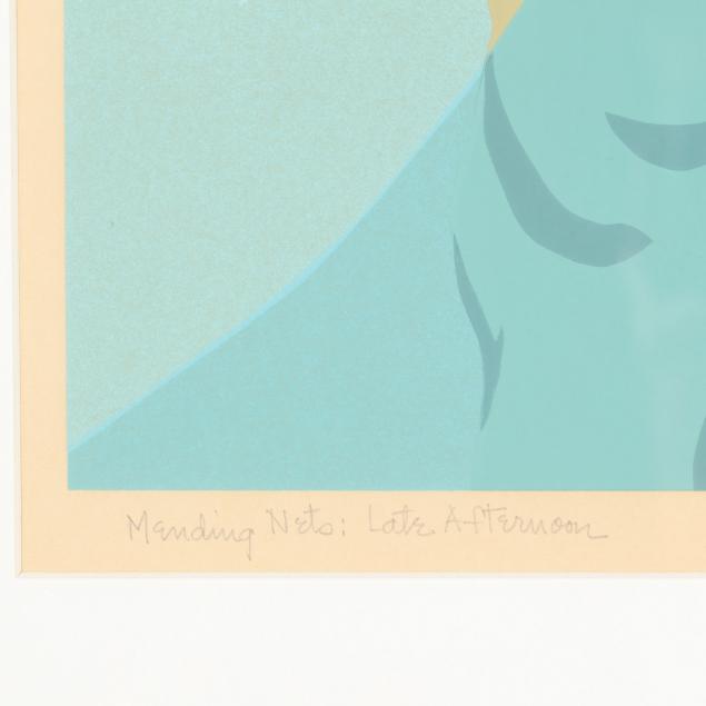 Serigraph in colors, 1977, pencil signed, titled, dated, and numbered 18/300 lower margin, from the Mending Nets series, accompanied by publication information from Firefox Fine Arts, Inc., framed.