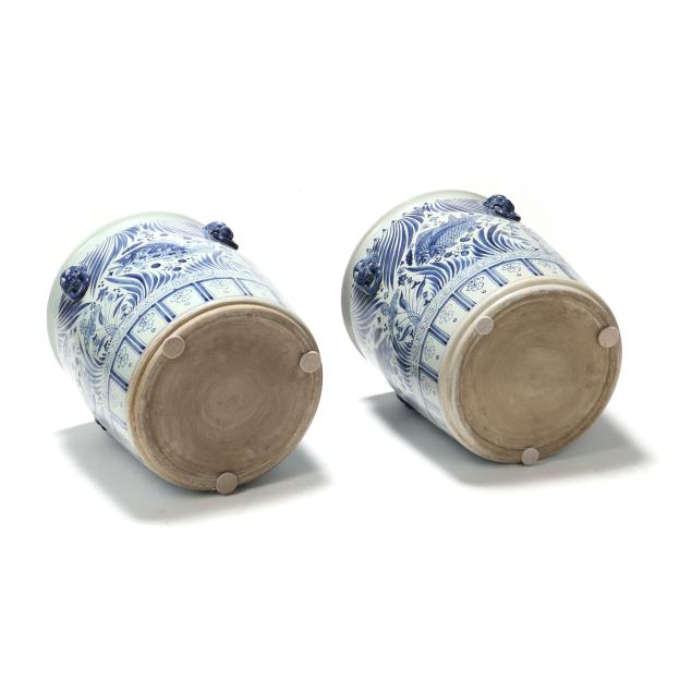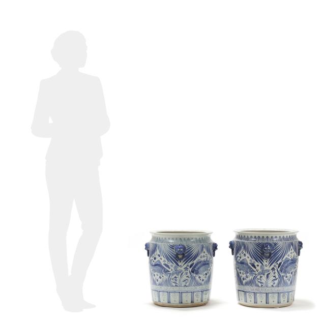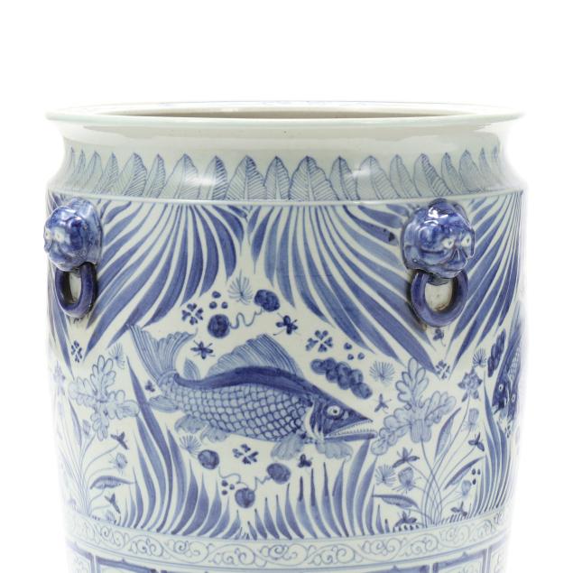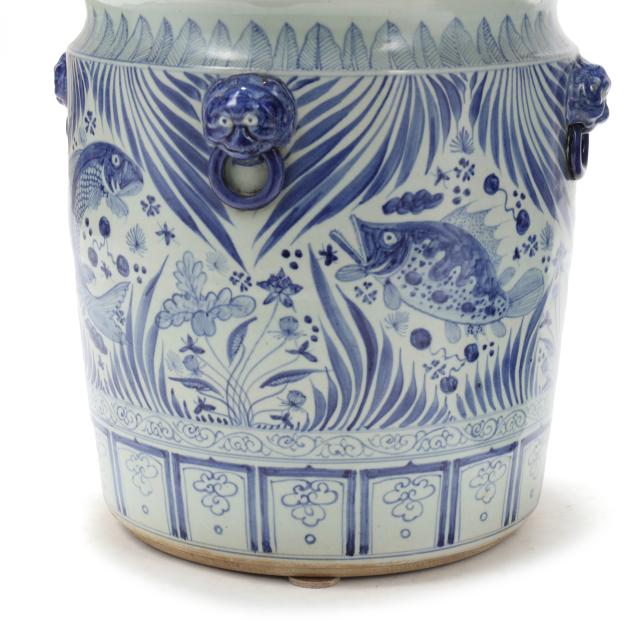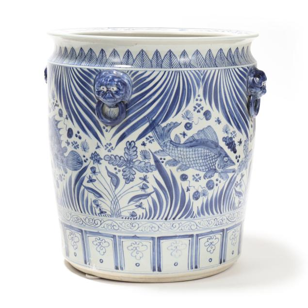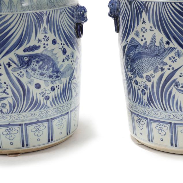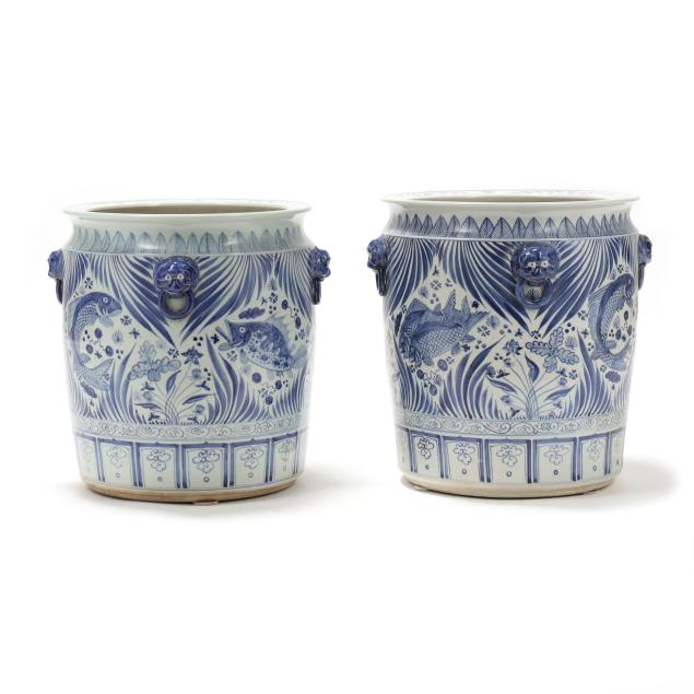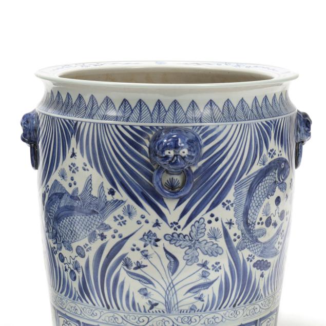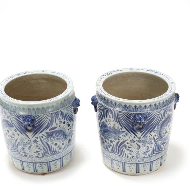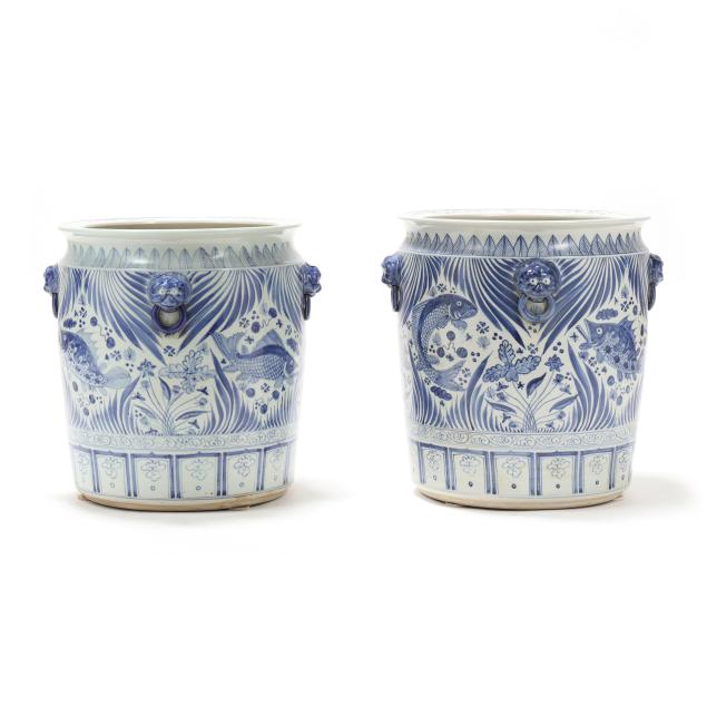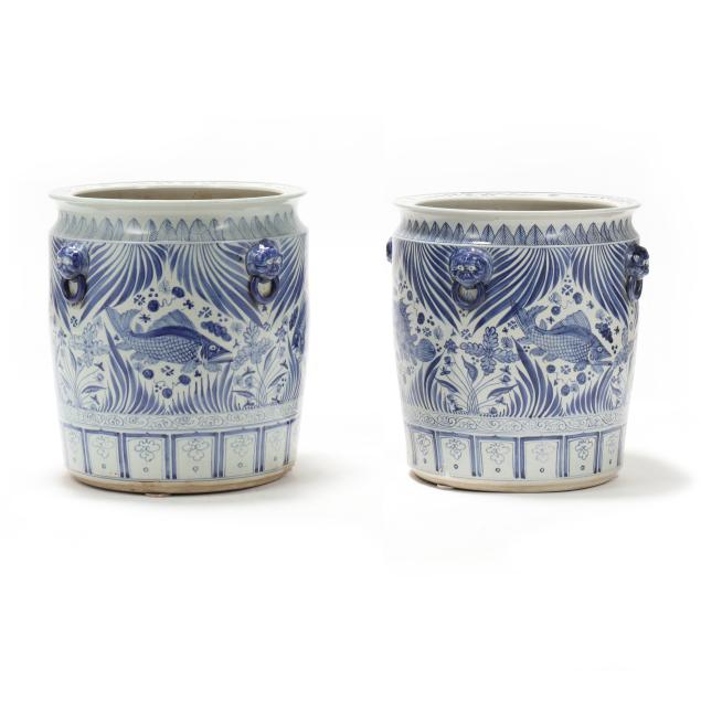Late 20th century, Ming style blue and white glazed jardinieres with four faux foo lion mask handles to shoulder, decorated with fish and foliate motifs, unmarked.