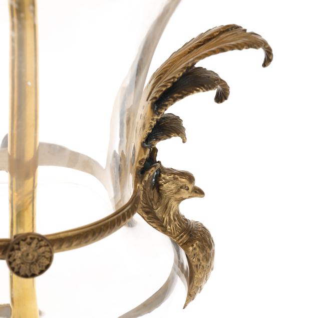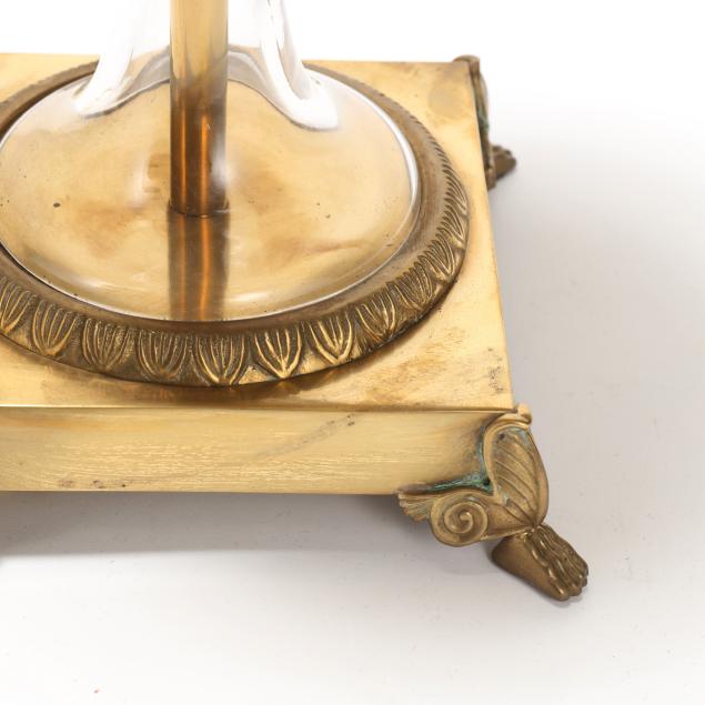 Late 20th century, both in the form of glass footed urns with brass mounts and two phoenix handles, mounted to square brass plinth raised on four paw feet, marked to undersides with labels and "MADE IN CHINA", includes two brass artichoke finials.