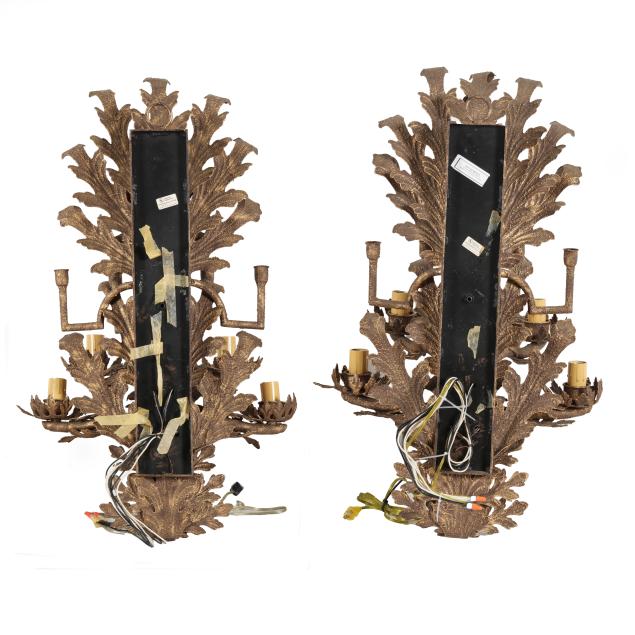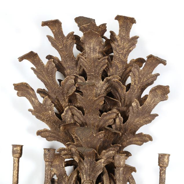 Late 20th century, textured and antiqued gold finished metal eight light form sconces, four wired lights with faux candle mounts and four candle stems, the whole with spreading acanthus leaves, one labeled to posterior, includes two metal wall mounts.