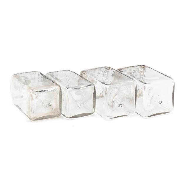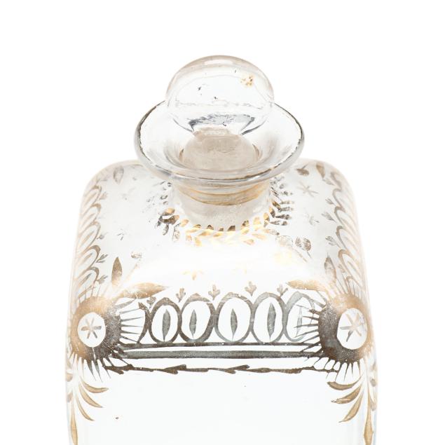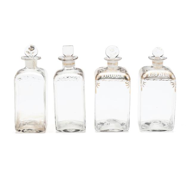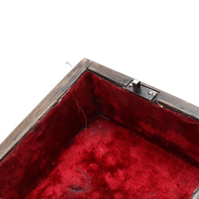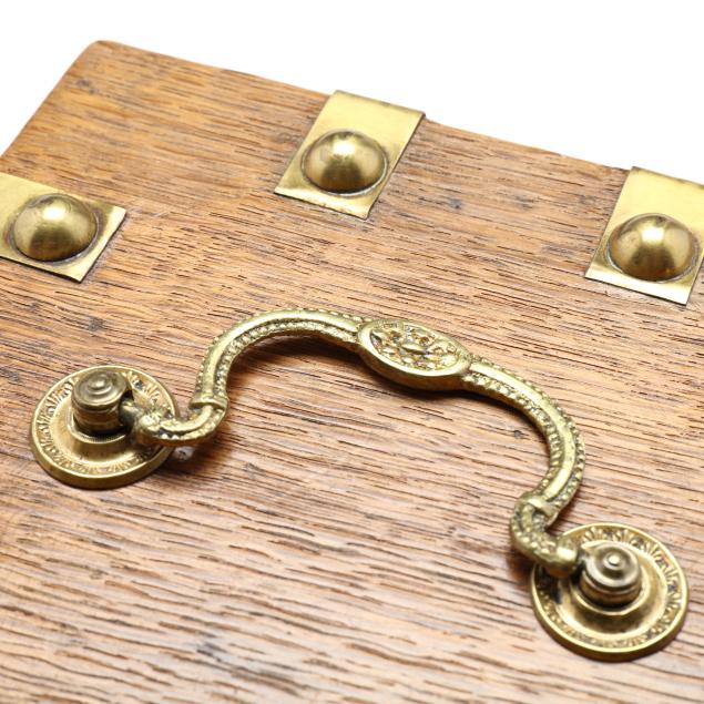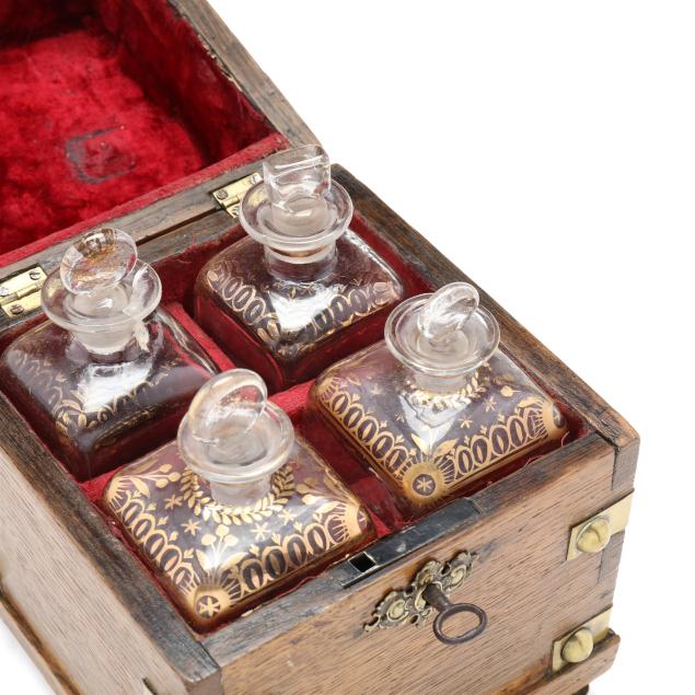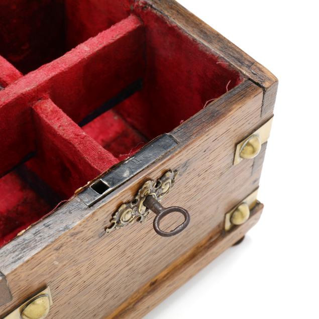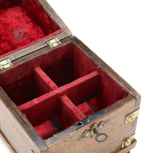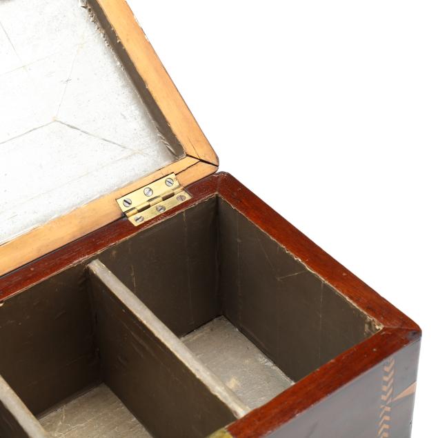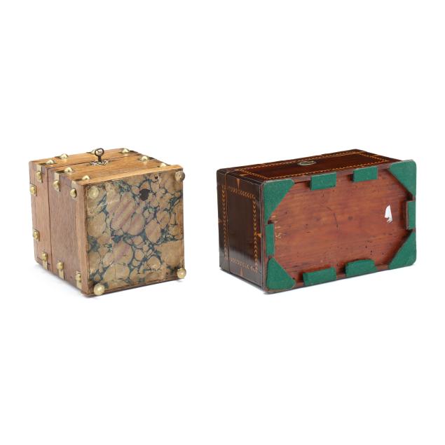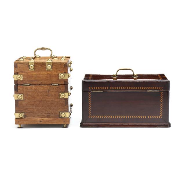 The first a George III inlaid mahogany tea caddy, with satinwood or sycamore herringbone and triangular parquetry inlays, brass mounted key escutcheon and swan neck lid pull; opens to a divided interior with later paper, unmarked save handsaw shape mark to hinges (6 1/2 x 11 1/2 x 6 1/4 in.); the second a dovetailed oak decanter box, English or French, mid-19th century, with brass bound bossed strapping, fancy brass escutcheon mount and lid pull, opens to a magenta velvet lined interior, fitted with four period gilt decorated glass decanters with stoppers, lid fitted for a traveling glass, raised on cast brass feet, with marbled paper underside, unmarked (8 3/4 x 7 14 x 7 1/4 in.)