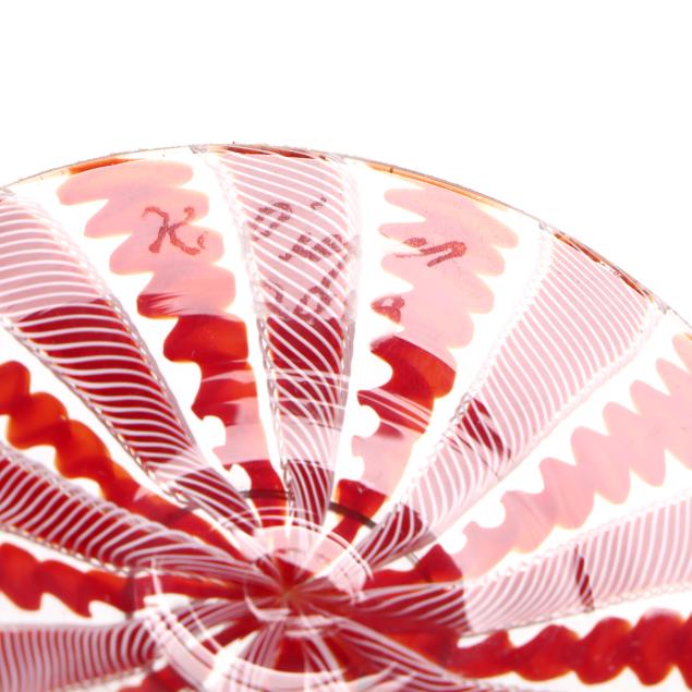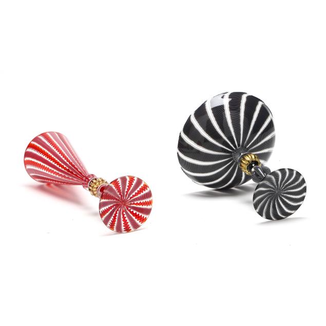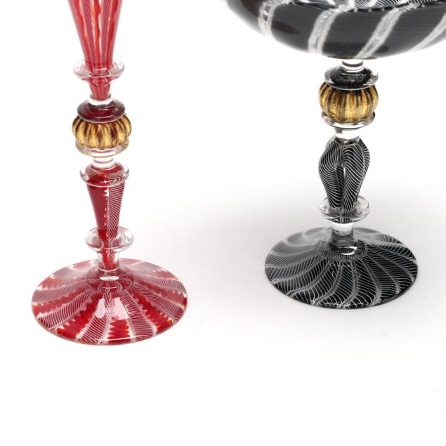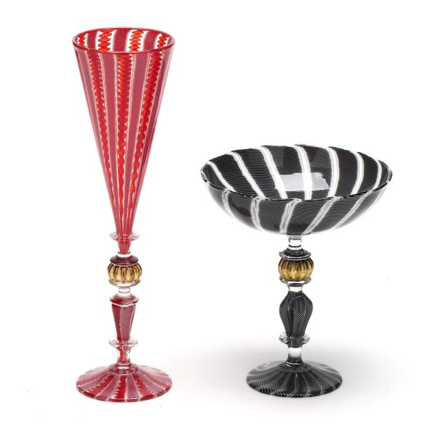 Including a 2015 red and white cane blown glass trumpet flute with gold leaf knop stem (11 1/8 x 3 1/8 x 3 1/8 in.); and a 2017 black and white cane compote with gold leaf knop over four arched open supports on a spiral foot (7 x 6 x 6 in.), both signed.