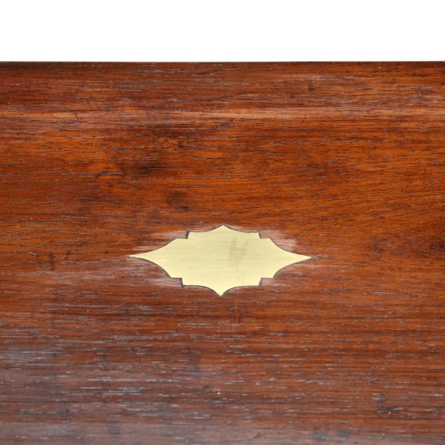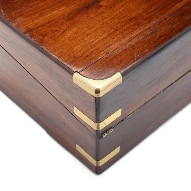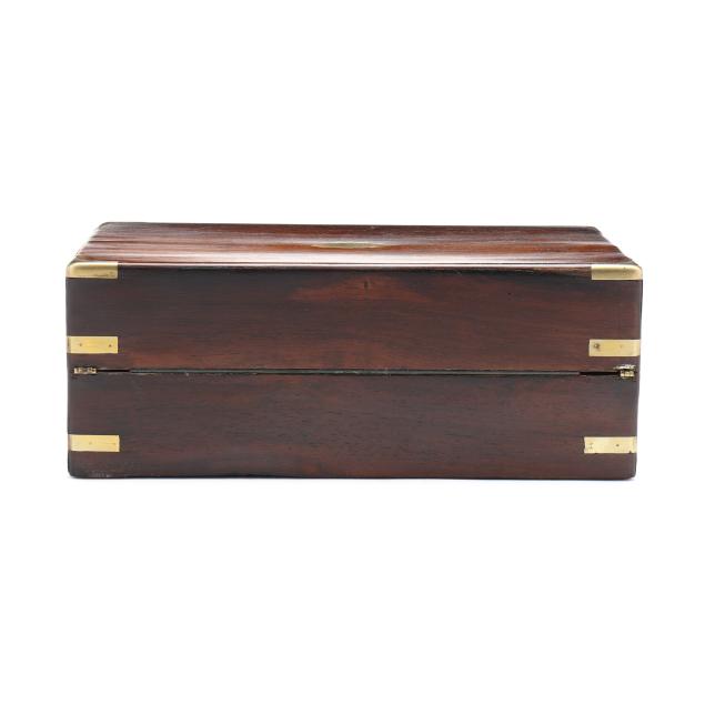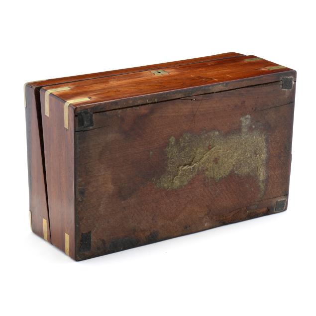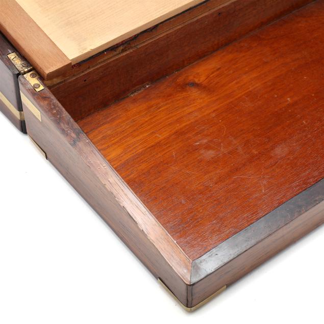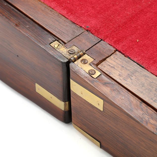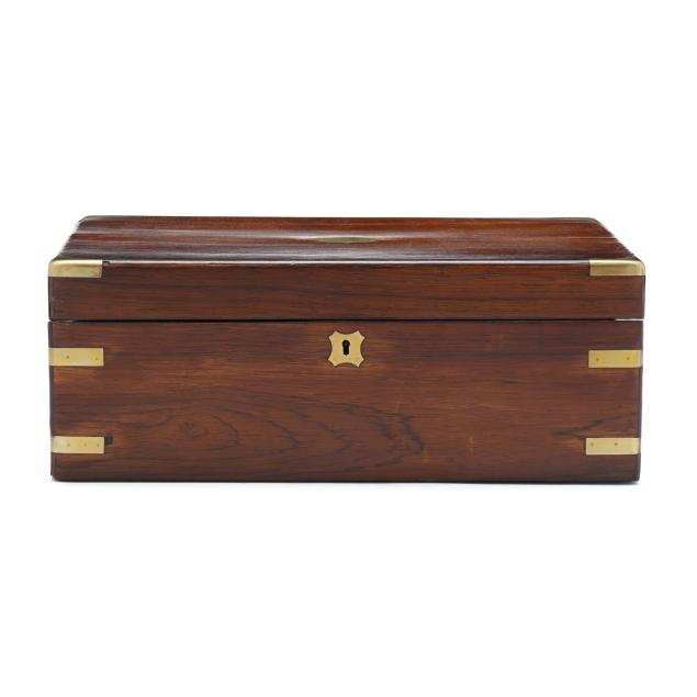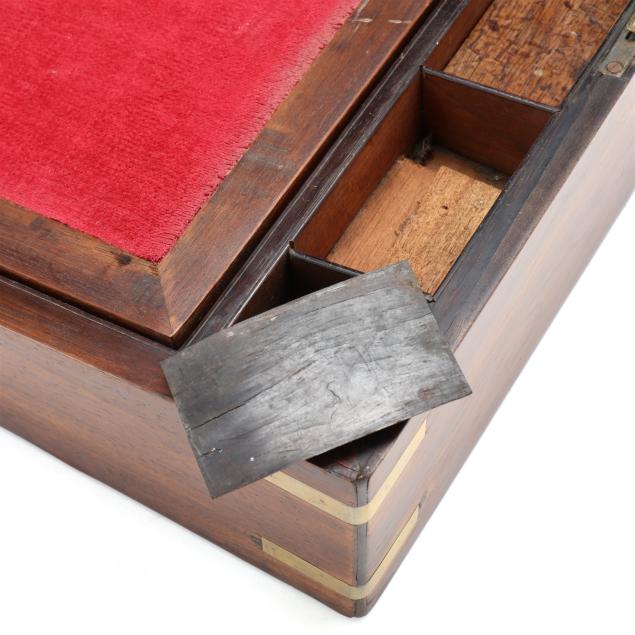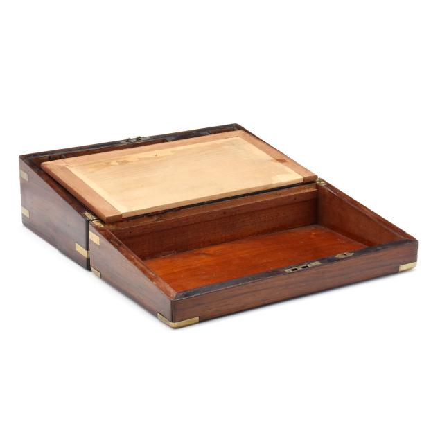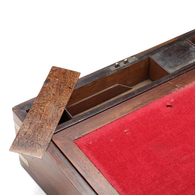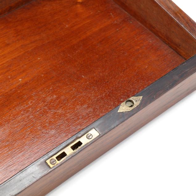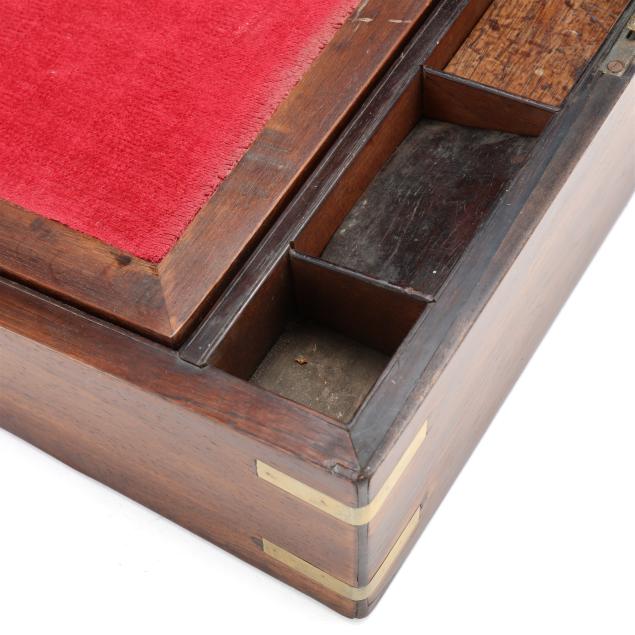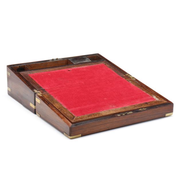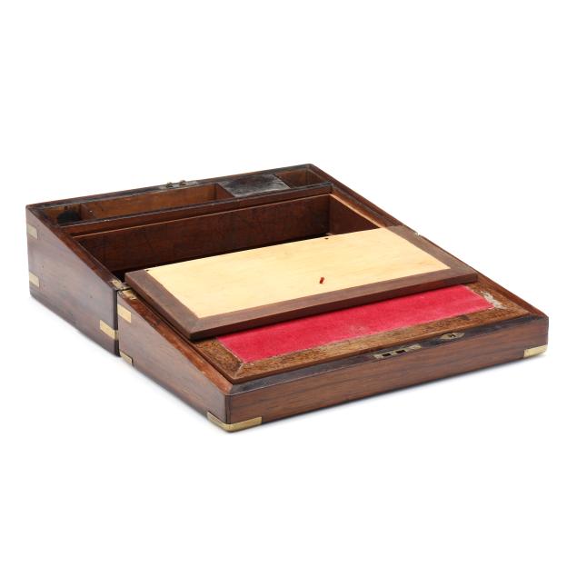 Second half 19th century, unmarked, rosewood veneers, mahogany and deal secondary, of rectangular form with inlaid brass mounts, inlaid shaped brass key and lid escutcheons, opening to divided pen and ink compartments, magenta velvet writing service lifting to open storage.