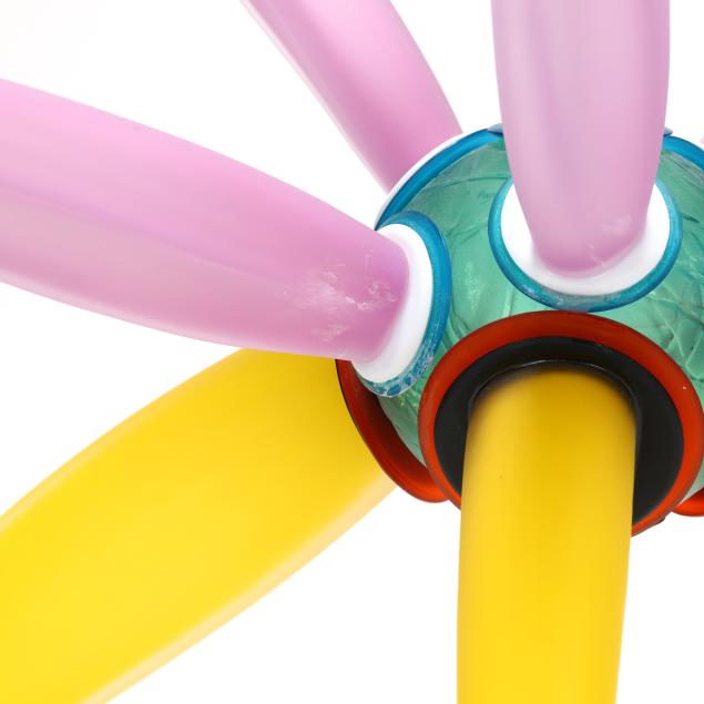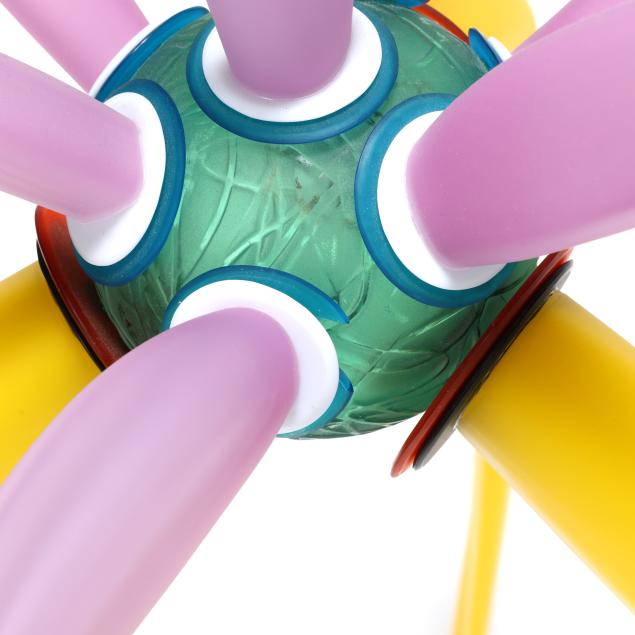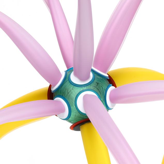 Blown multi color satin glass adhered to glass discs and central orb, signed.