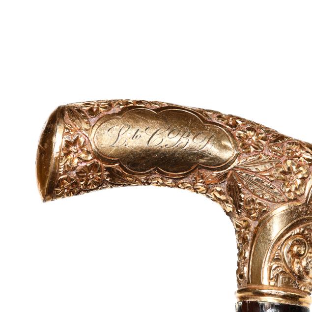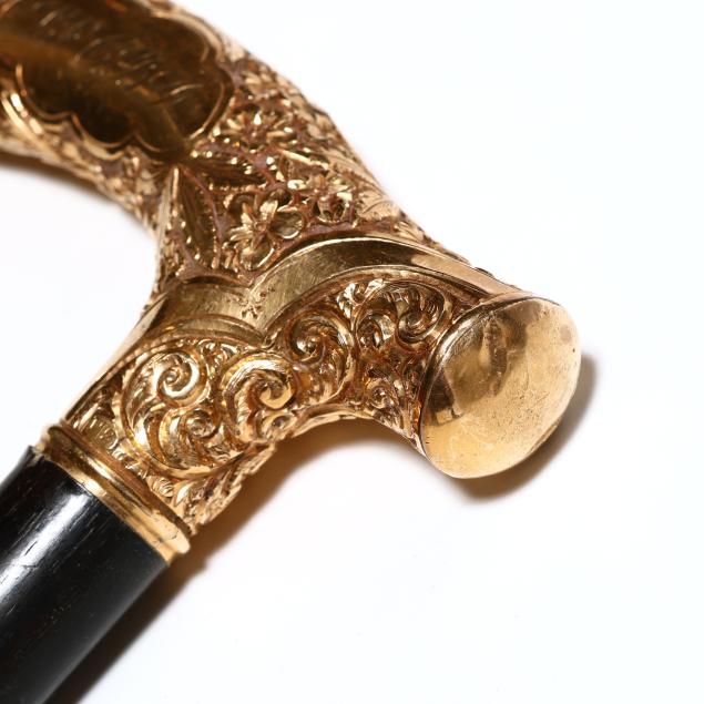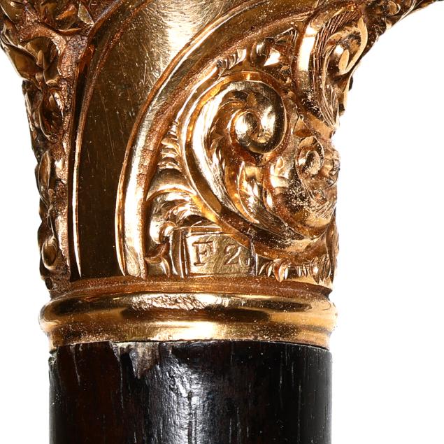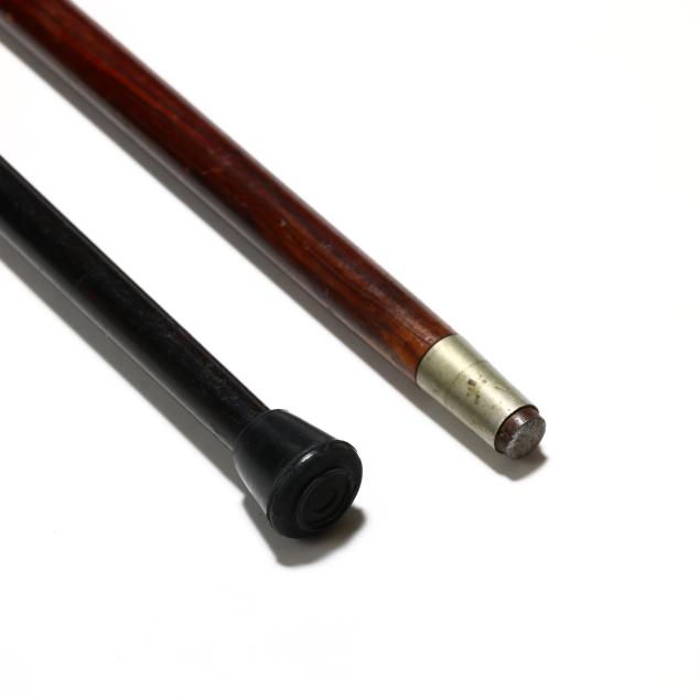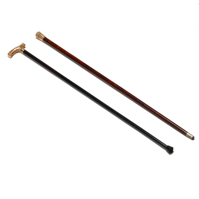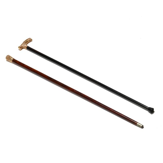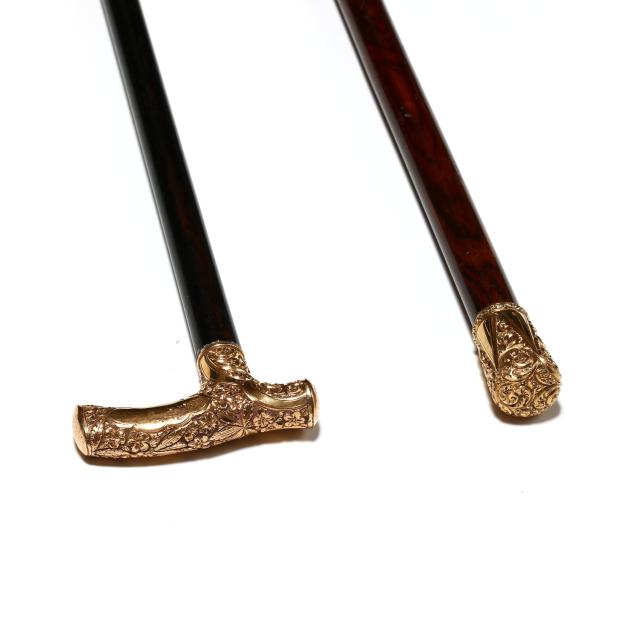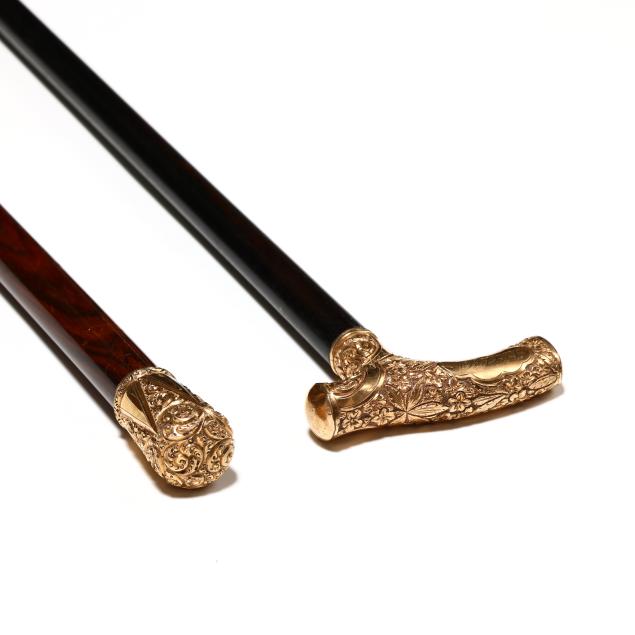 Late 19th to early 20th century, the first with derby handle, chased with floral and foliate motifs, marked "F2" and with period engraved dedication to the cartouche "L to C.B. D.", over an ebony shaft with rubber ground tip (34 1/2 x 3 3/4 x 1 in.); the second with knob handle engraved with stylized frond motifs and triangular reserves, unmarked, over a rosewood shaft with metal ground tip (35 1/4 x 1 1/2 x 1 1/2 in.).