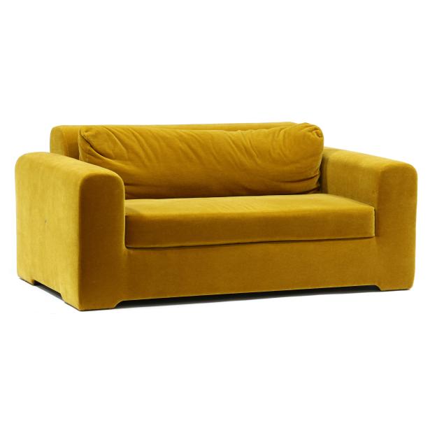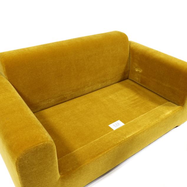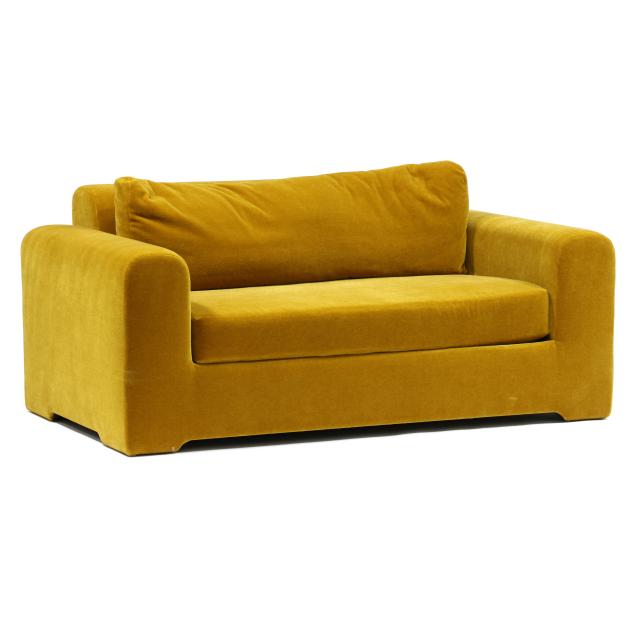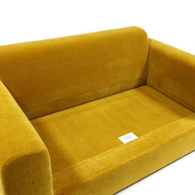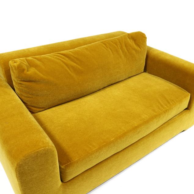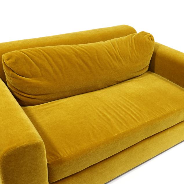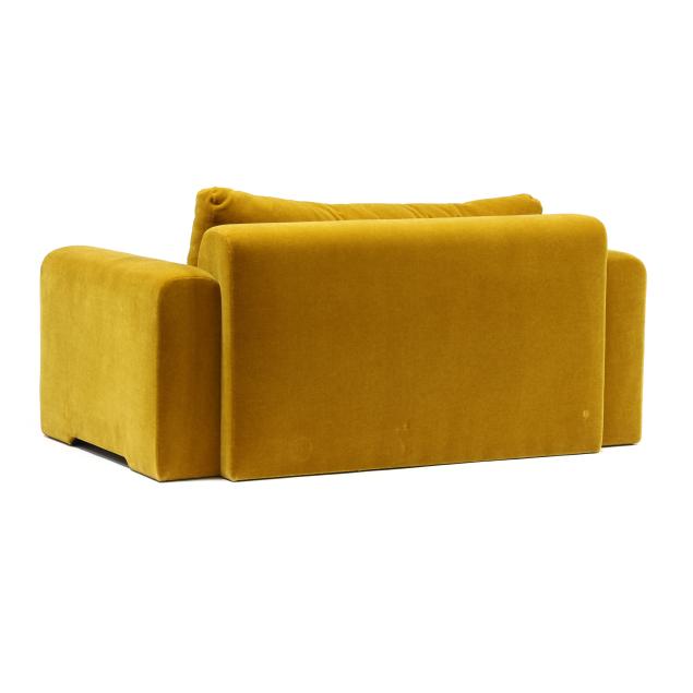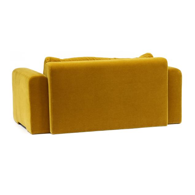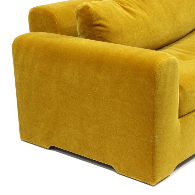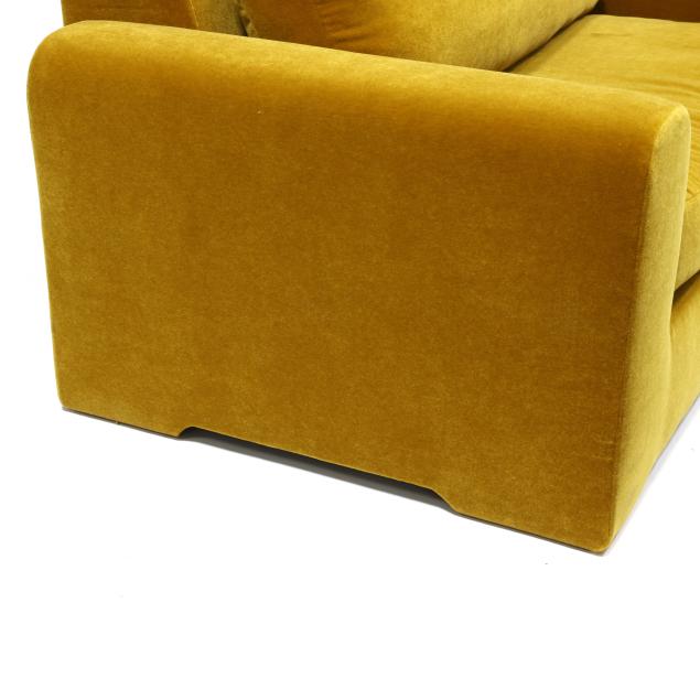 Bold over-upholstered frames in plush golden mohair fabric with down filled back cushion and foam seat, nearly flush feet, labeled.