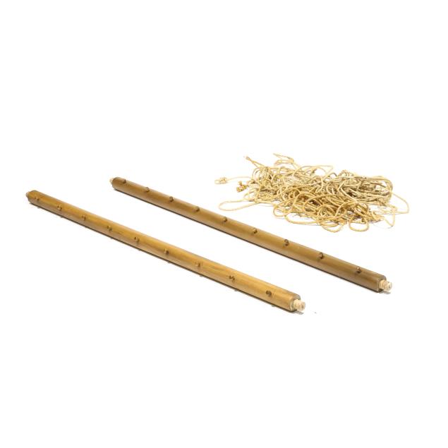 19th century, egg shaped turned finial, turned horizontal rails with shaped seasonal panel headboard, turned dowel connector rails with pegs for rope suspension.