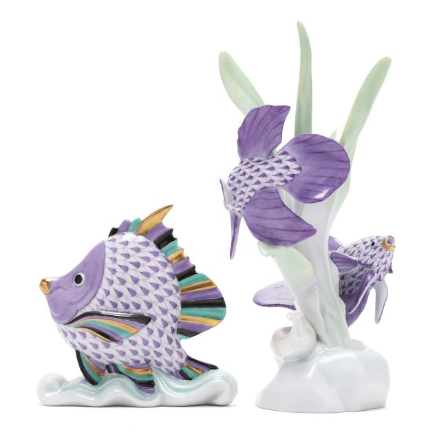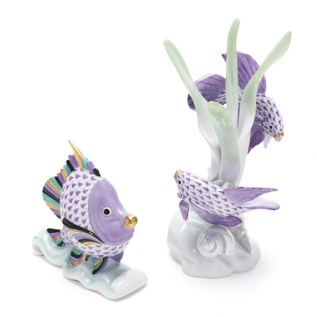 Herend, Two Lavender Fishnet Porcelain Fish Figurines