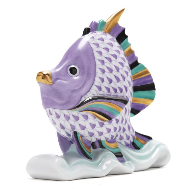Hungary, hand-painted and gilt porcelain, (2) figurines to include a #5286 group of betta fish (8 5/8 x 4 x 4 in.), and a #15355 tropical fish on wave (4 1/2 x 4 1/4 x 1 7/8 in.), both marked with company backstamps to underside.