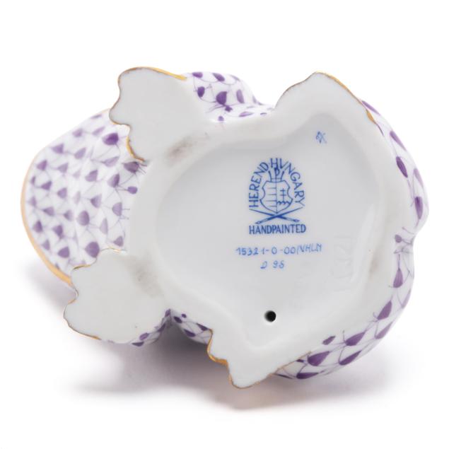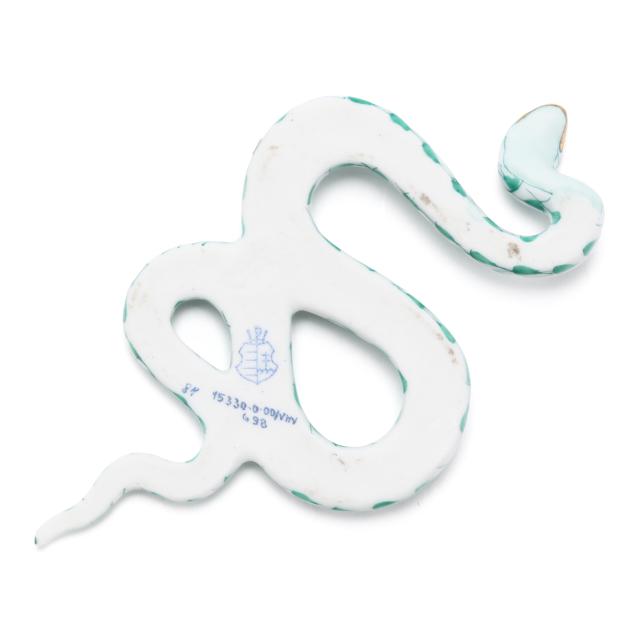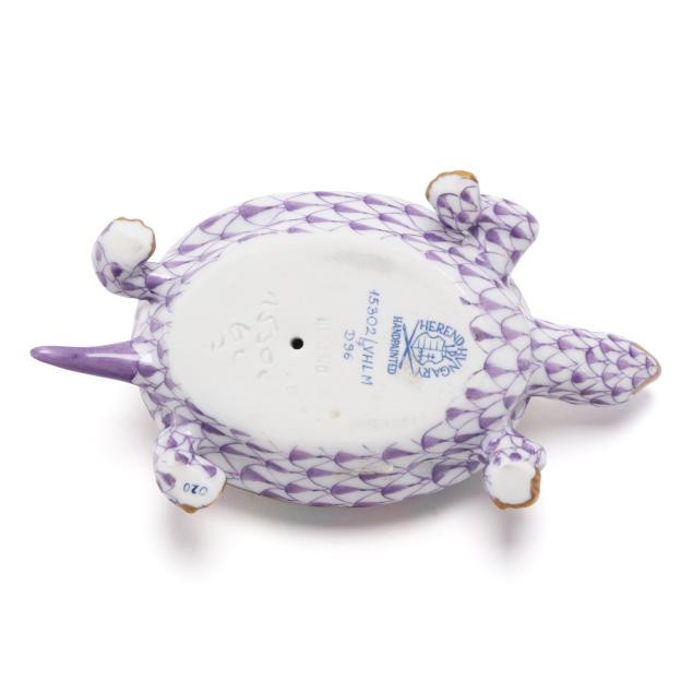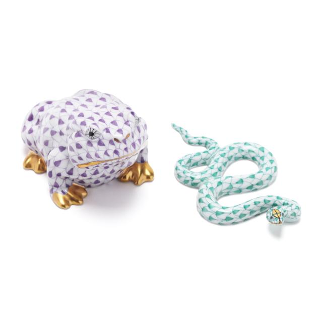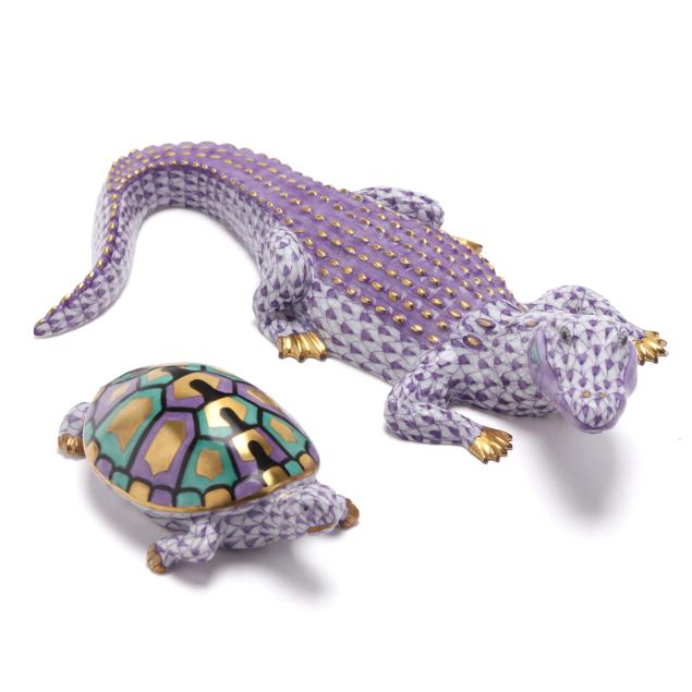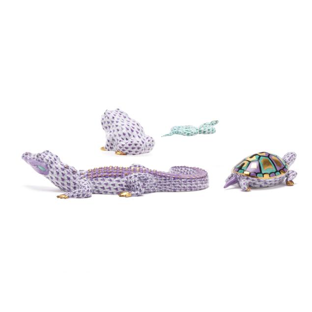 Hungary, hand-painted and gilt porcelain, (4) animals to include a lavender fishnet #15540 alligator (1 3/ x 7 3/4 x 3 1/2 in.); a green fishnet #15330 snake (1/2 x 3 1/2 x 2 in.; a lavender fishnet #15302 turtle (1 1/4 x 4 x 2 1/4); and a lavender fishnet #15321 frog (2 x 2 1/4 x 2 in.), all marked with company backstamp to underside.