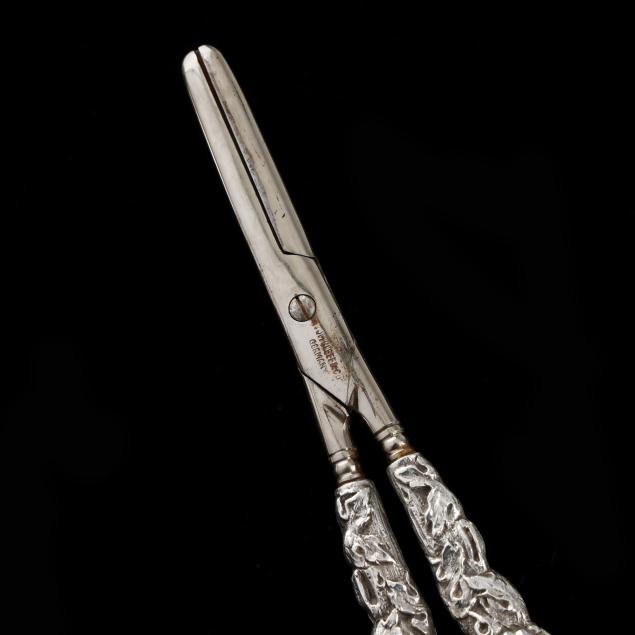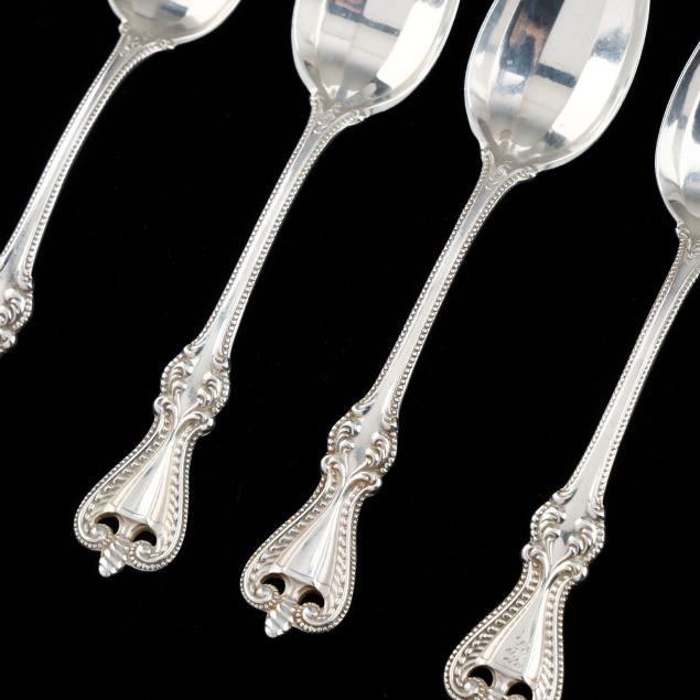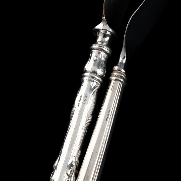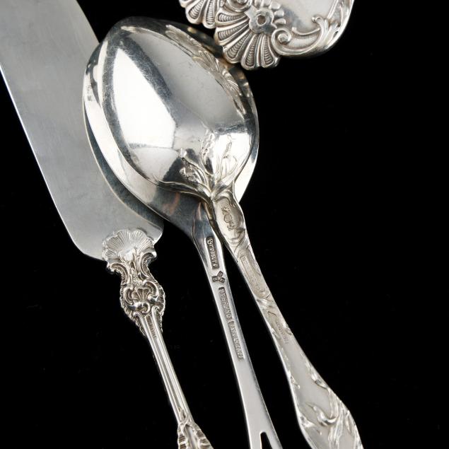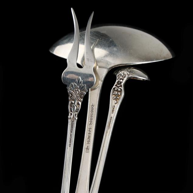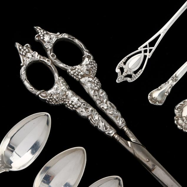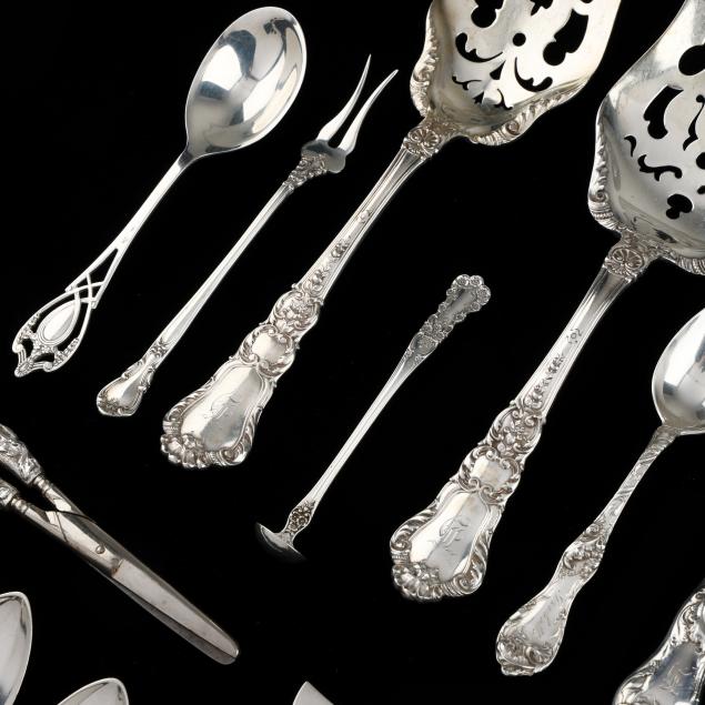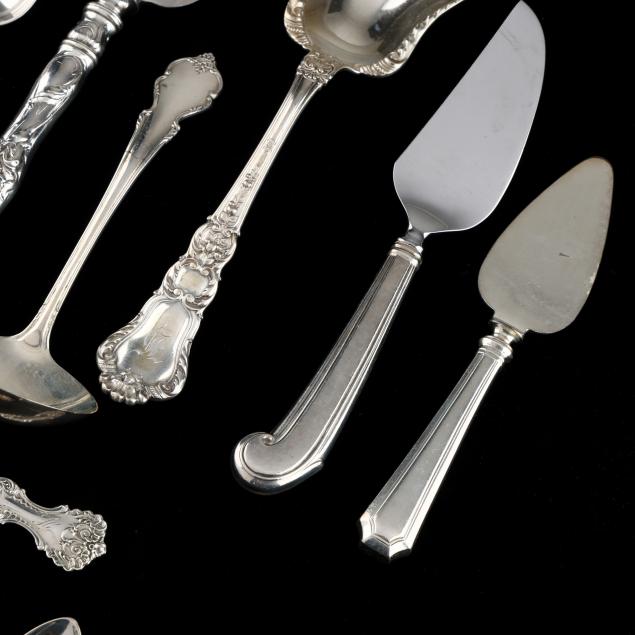 Old Colonial grapefruit spoons, monogrammed; and (10) assorted sterling and sterling handled servers including a pie or cake server, two cheese knives, a gravy ladle, a master butter spreader, a pair of grape shearers, a pickle fork, a sugar spoon, a teaspoon, and a mustard ladle, various makers and monograms.