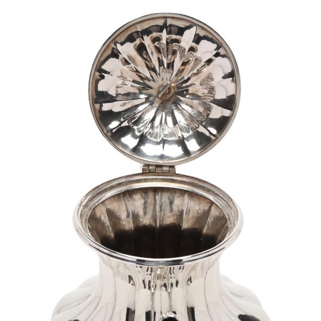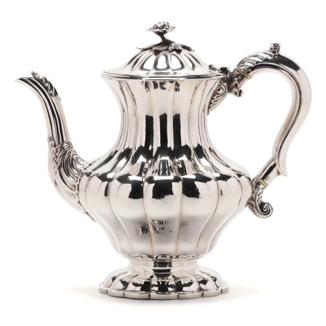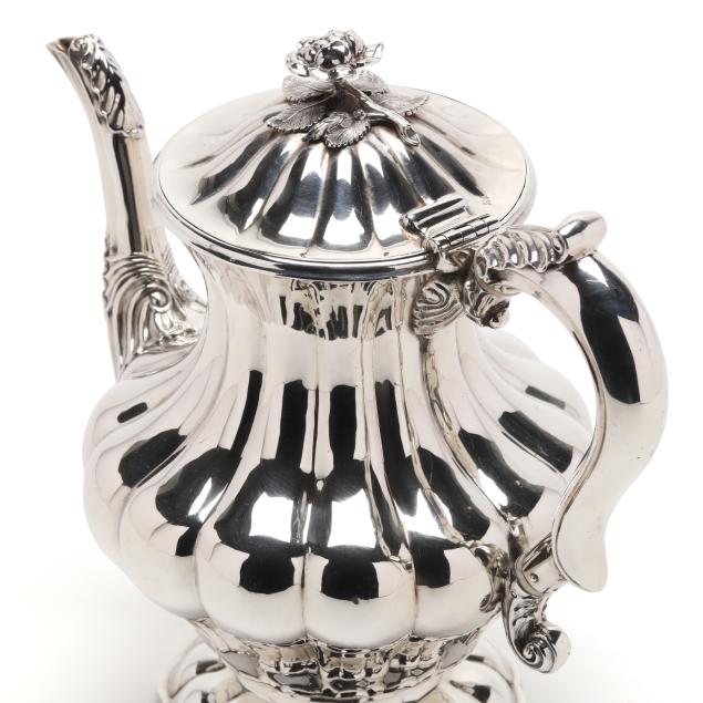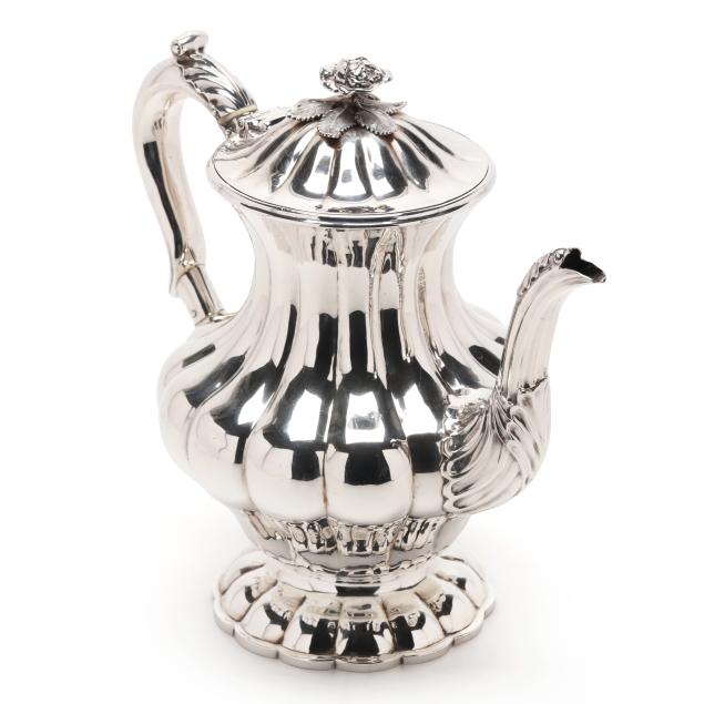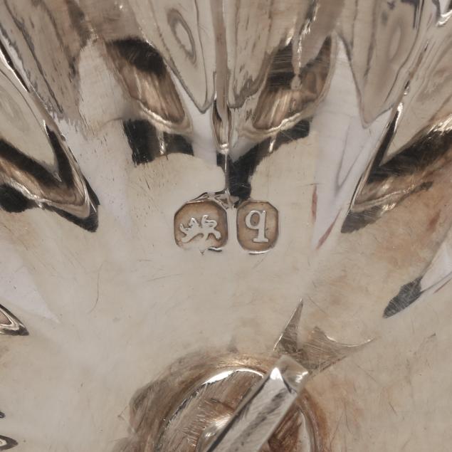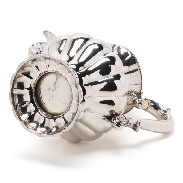With partially obscured hallmarks, featuring a lobed body and foot, with a shell form spout and rose finial, not monogrammed.
