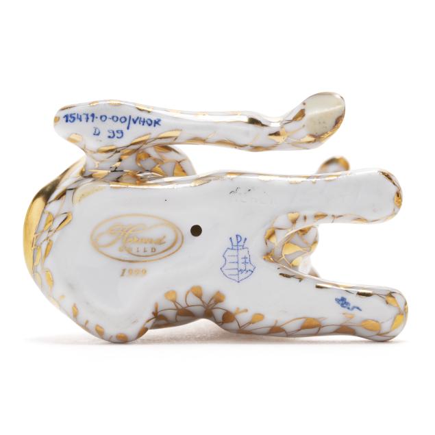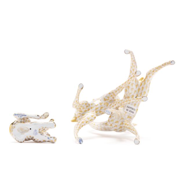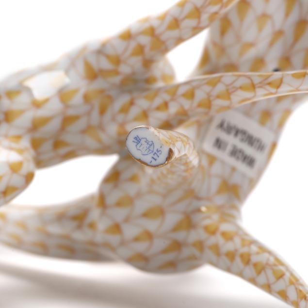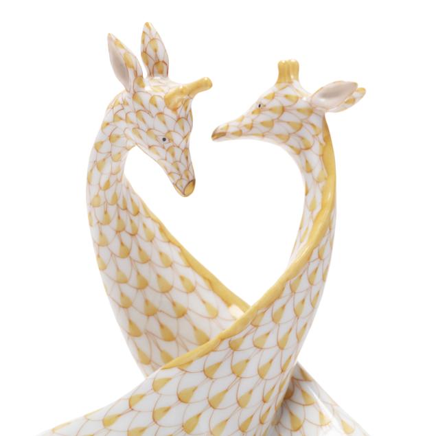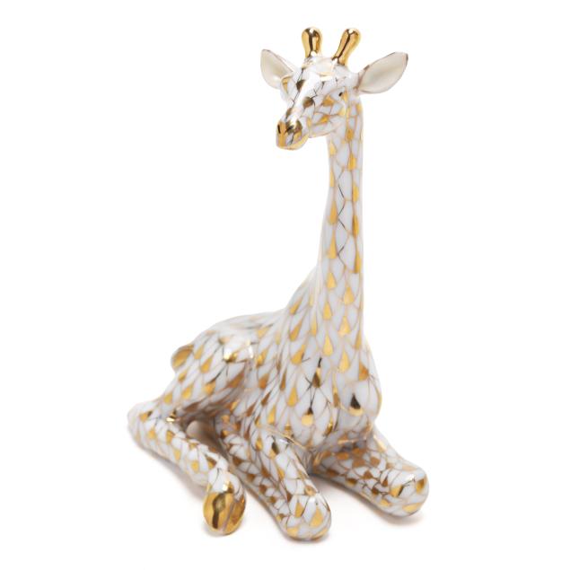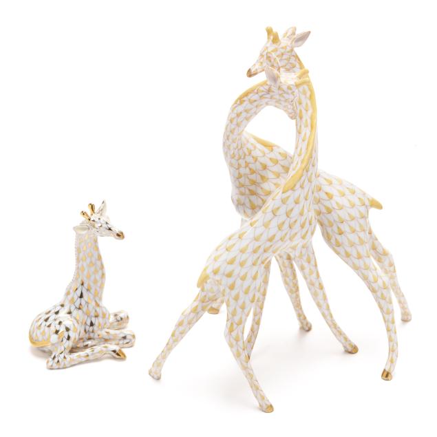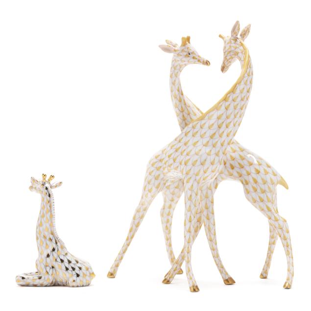 Hungary, hand-painted and gilt porcelain, (2) figurines to include a butterscotch fishnet #15283 pair of giraffes; and a gold fishnet #15479 Herend Guild 1999 giraffe, both marked with company backstamp to underside, pair with "MADE IN HUNGARY" label.