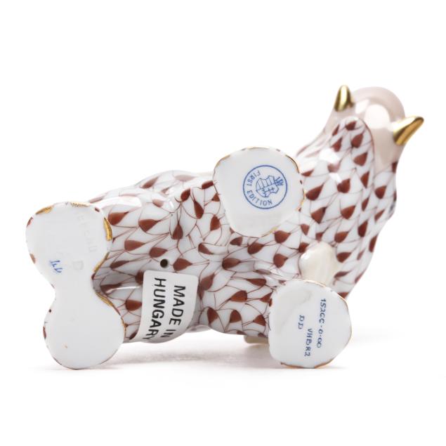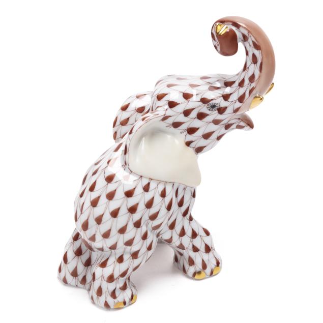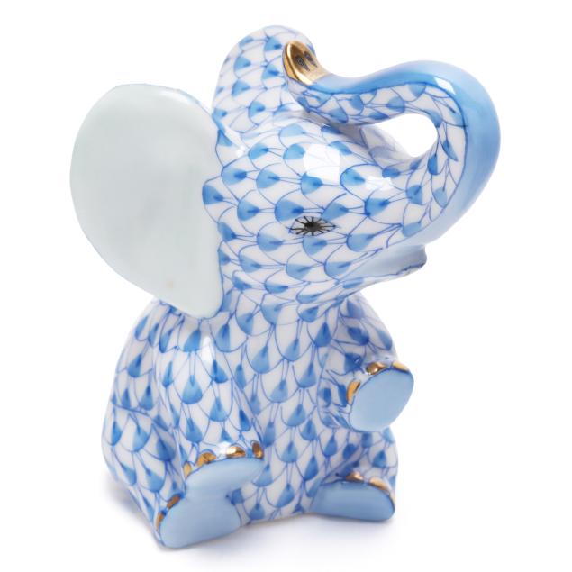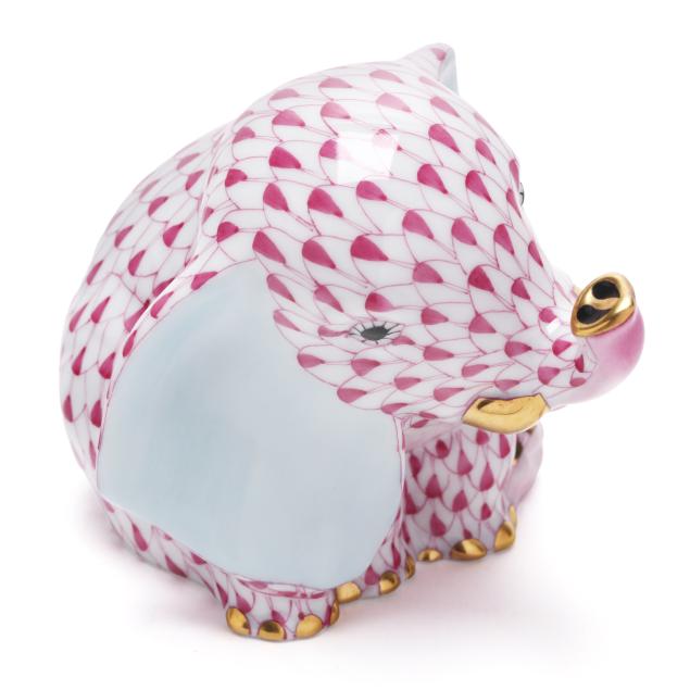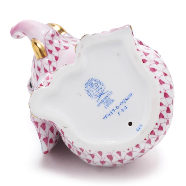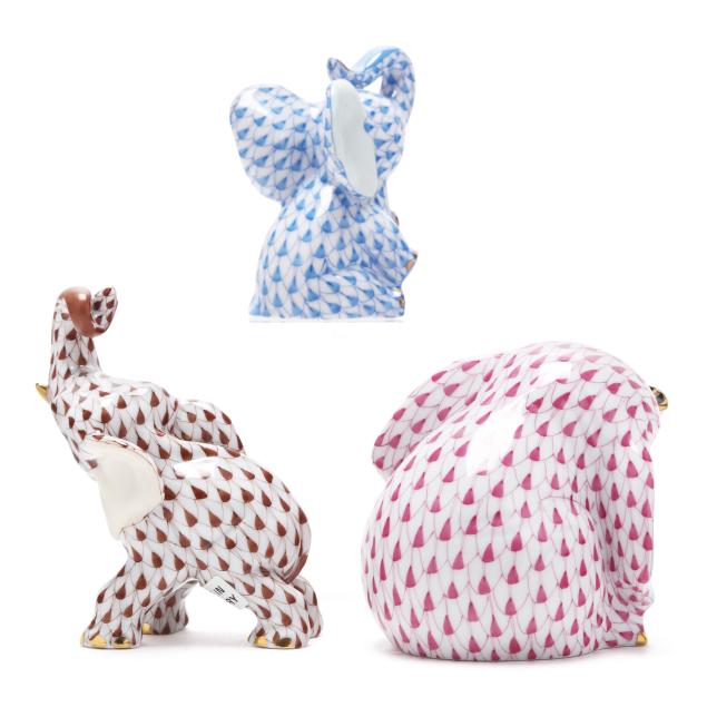Hungary, hand-painted and gilt porcelain, (3) pieces to include a raspberry fishnet #15429 first edition "eavesdropping" elephant; a chocolate fishnet #15266 first edition joyful elephant; and a blue fishnet #15511 baby elephant, all marked with company backstamp to underside.