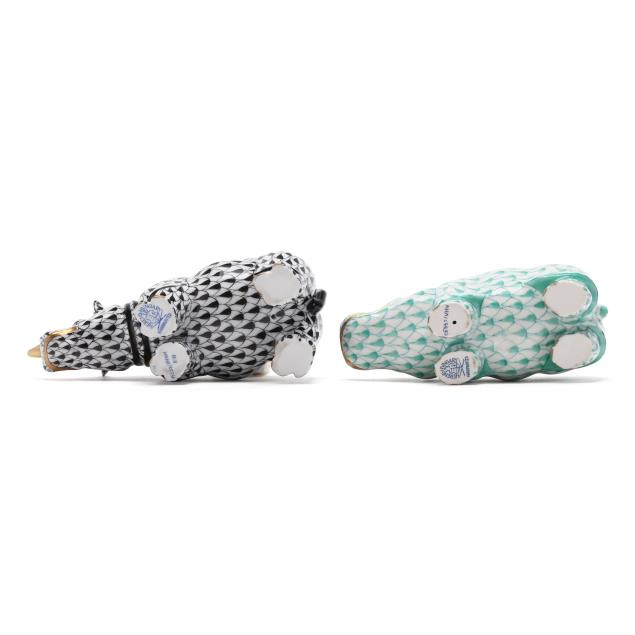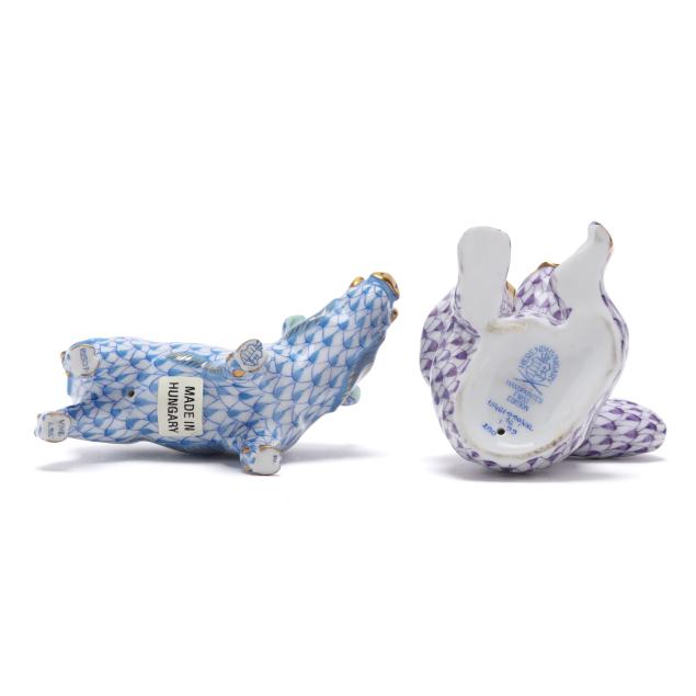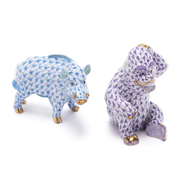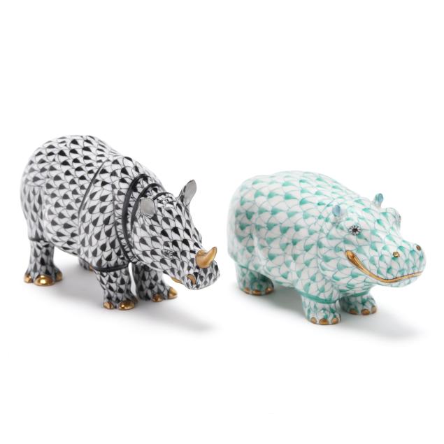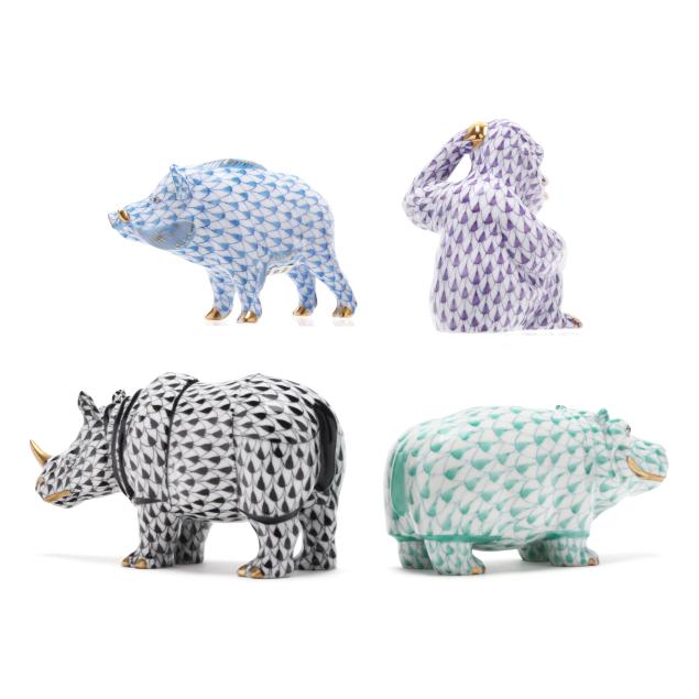 Hungary, hand-painted and gilt porcelain, (4) animals to include a black fishnet #15333 rhino; a green fishnet #15332 hippo; a blue fishnet #15507 wild boar; and a lavender fishnet #15461 gorilla, all with company backstamp to underside.