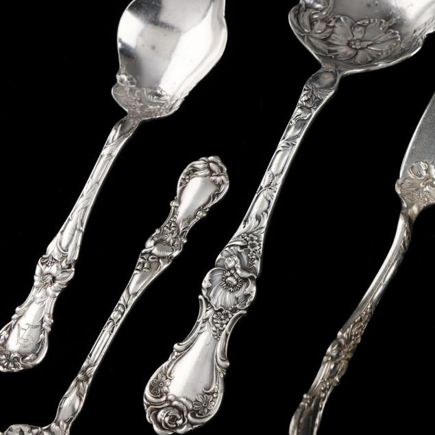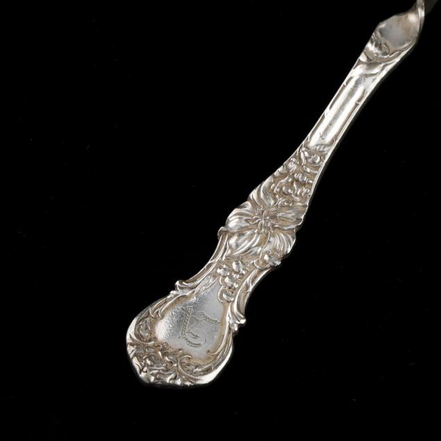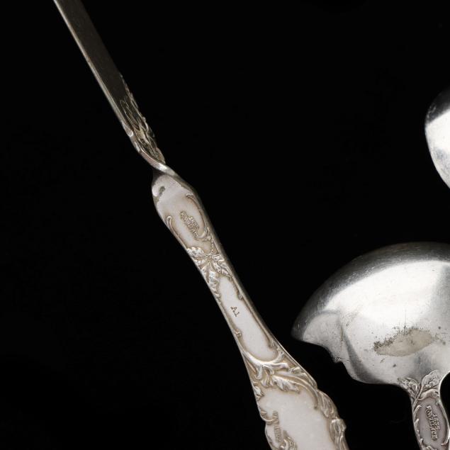 Includes a casserole spoon, sugar spoon; master butter spreader, and cream ladle, one monogrammed.