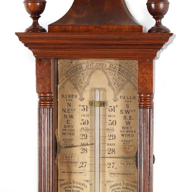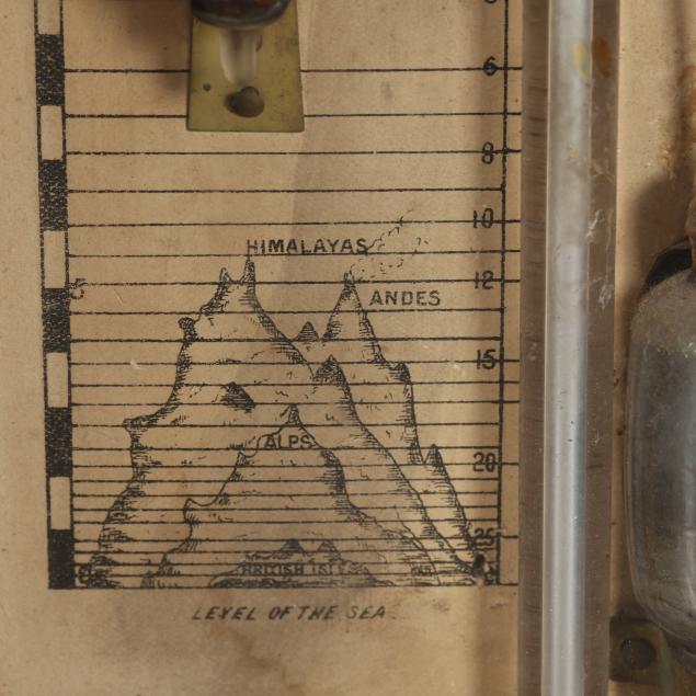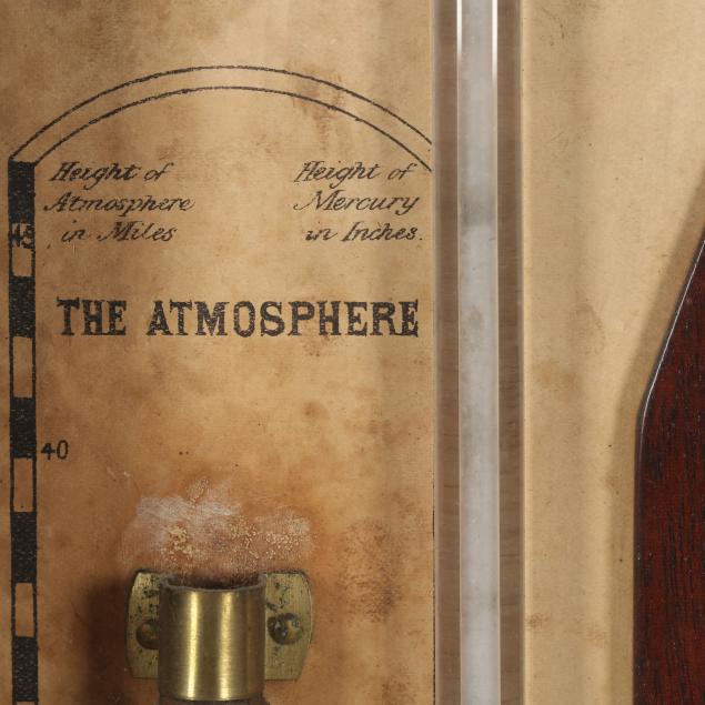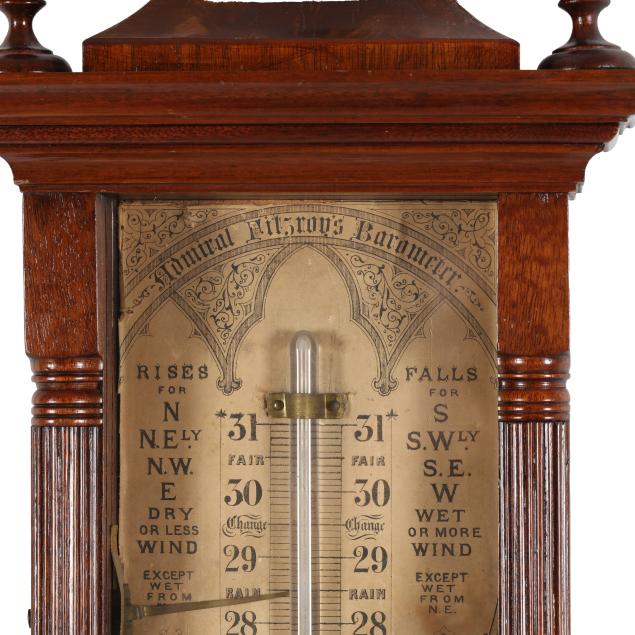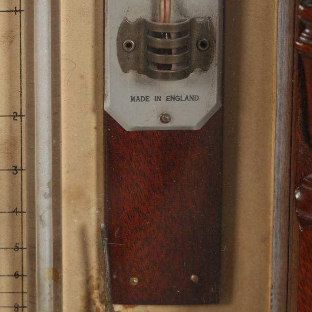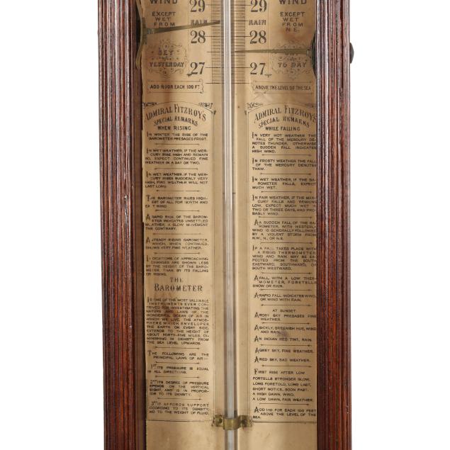Some minor areas of shrinkage to veneers; age toning to paper dial; storm glass appears to be empty; unknown if in proper working condition. Please note that due to the presence of mercury, this item cannot be shipped.