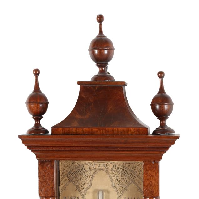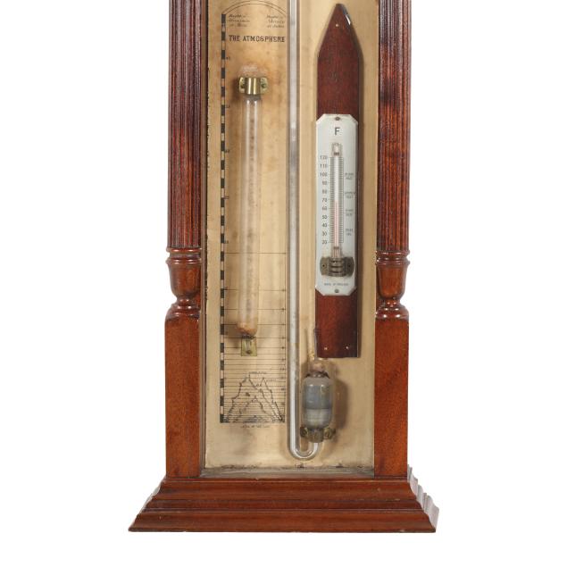 Circa 1880s, the instrument comprising long mercury tube, thermometer and storm glass, and paper dial, within architectural mahogany and glass case with fluted columnar stiles, surmounted by a stepped cornice with rising three finial pediment.