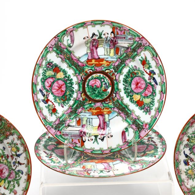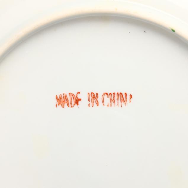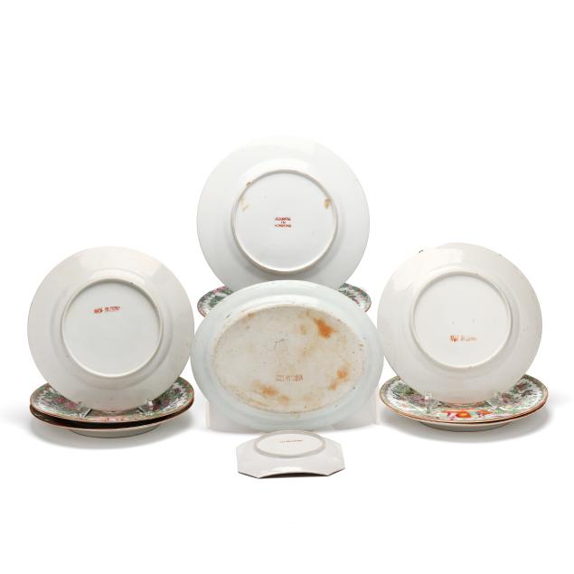 Mid to late 20th century, includes six dinner plates, all marked "MADE IN CHINA" in red to underside (9 3/4 in.), two dinner plates, marked "DESIGNED / IN / HONG KONG" in red to underside (10 3/8 in.), an oval platter, marked "MADE IN CHINA" to underside (11 1/4 in.), and a small square tray, marked "MADE IN CHINA" to underside (6 x 6 in.).