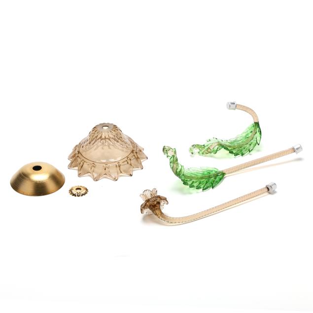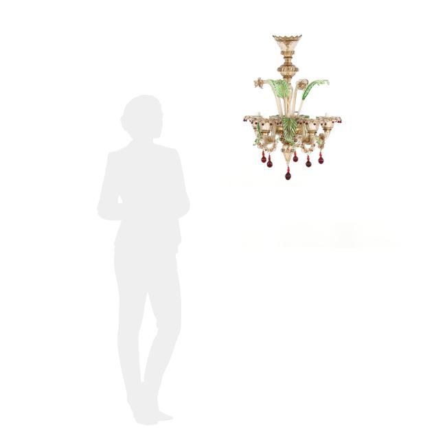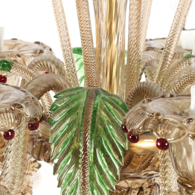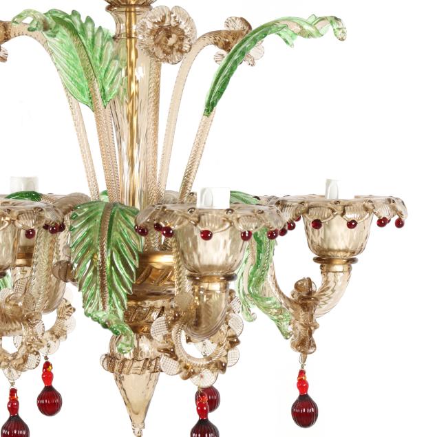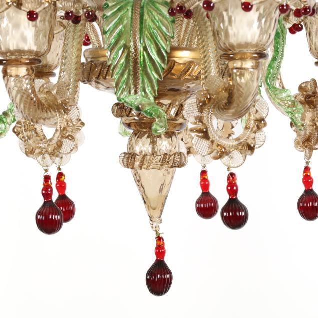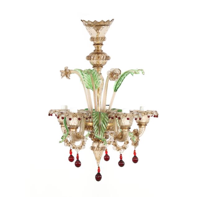 Venice, late 20th century, hand-blown glass in champagne, green, and red hues, issuing foliate and floral forms alternating with five upswept branch arms each adorned with ring and crimson drop pendants, unsigned,