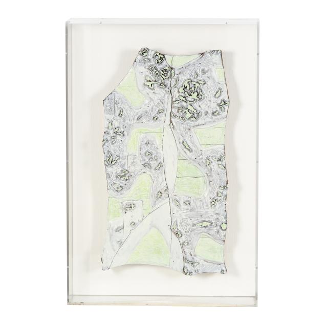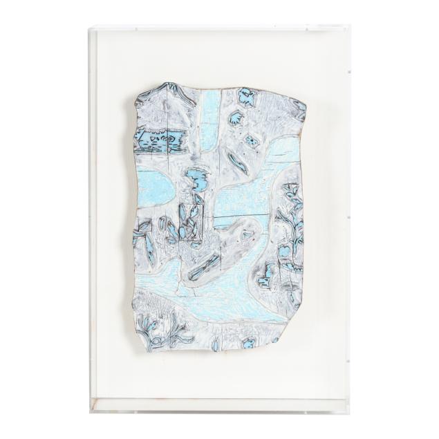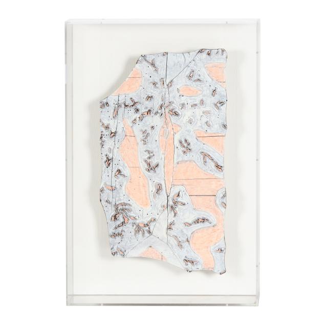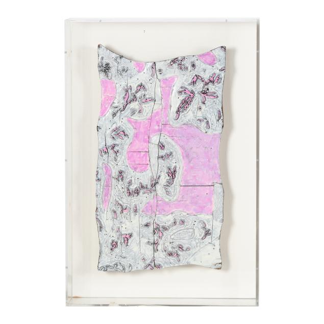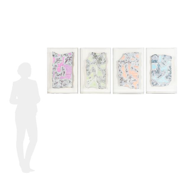 Circa 1930, likely French, with floral design, each mounted against a linen ground and presented within a custom acrylic case for wall display.